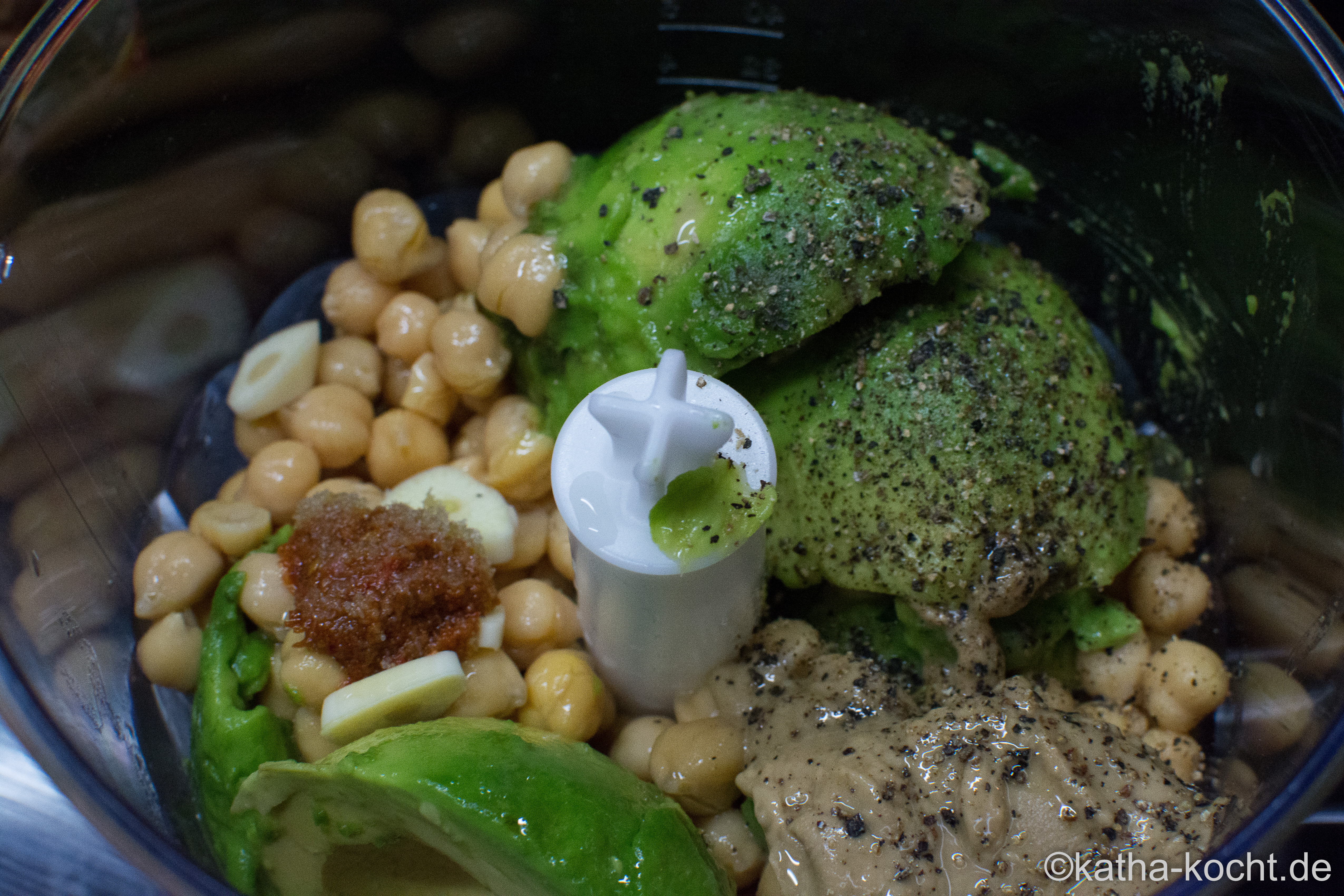 Die Kichererbsen, die geschälte und entkernte Avocado, die geschälte und grob gewürfelte Knoblauchzehe, die Sesampaste, das Sesamöl, Pfeffer und Salz und den Saft aus der halben Zitrone in den Mixer geben.