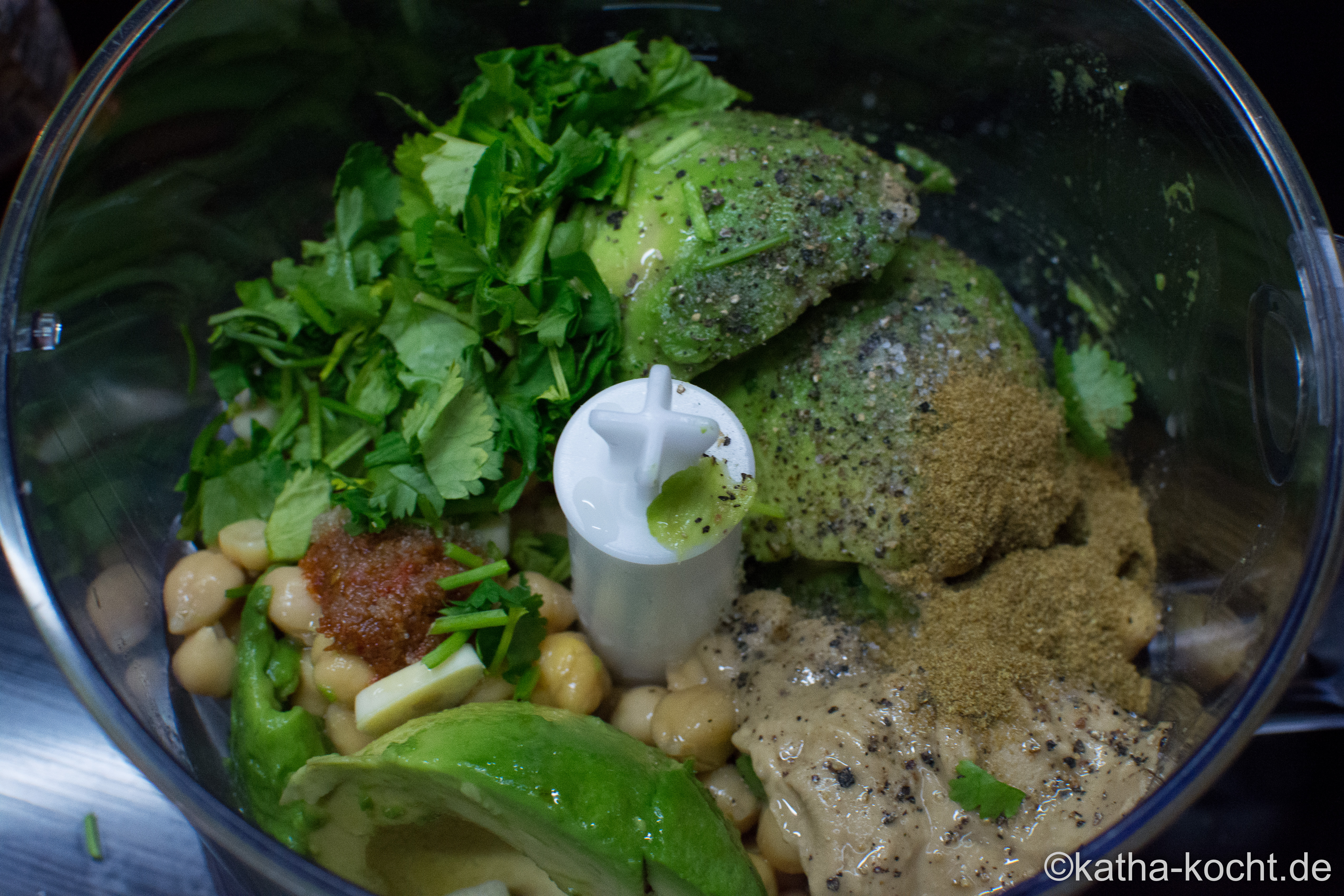 Cumin, den grob gehacktem Koriander und die Harissa Paste dazu geben. Alles durchmixen bis ihr eine glatte und leckere Creme habt.