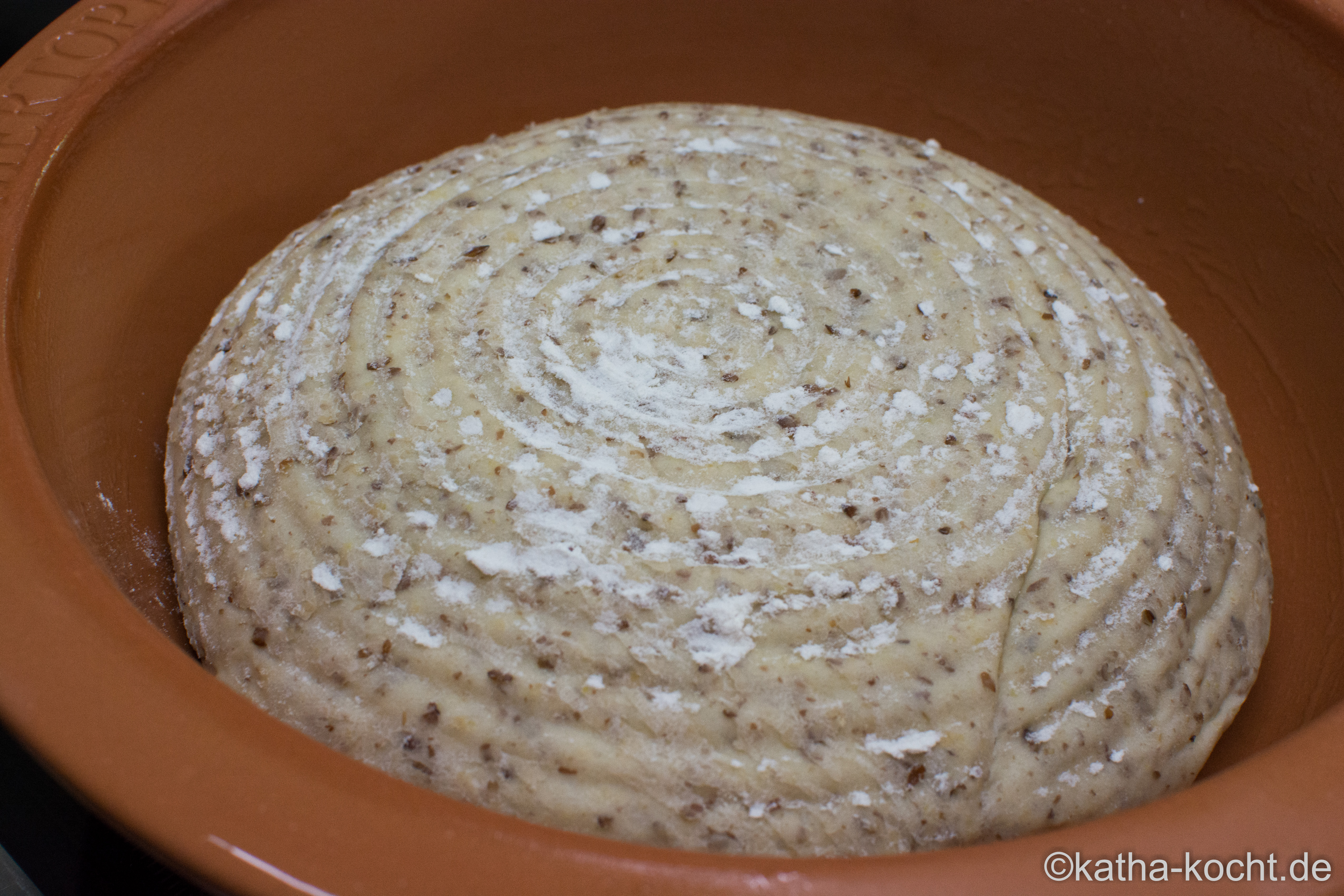 Gegen Ende der Zeit den Römertopf für 10-15 Minuten in der Spüle wässern. Abtrocknen, innen mit etwas Öl einpinseln und den Teig vorsichtig hinein kippen. Nochmal 30 Minuten gehen lassen.