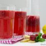 Die Ingwer Limonade mit Himbeeren in die vorbereiteten Gläser geben.