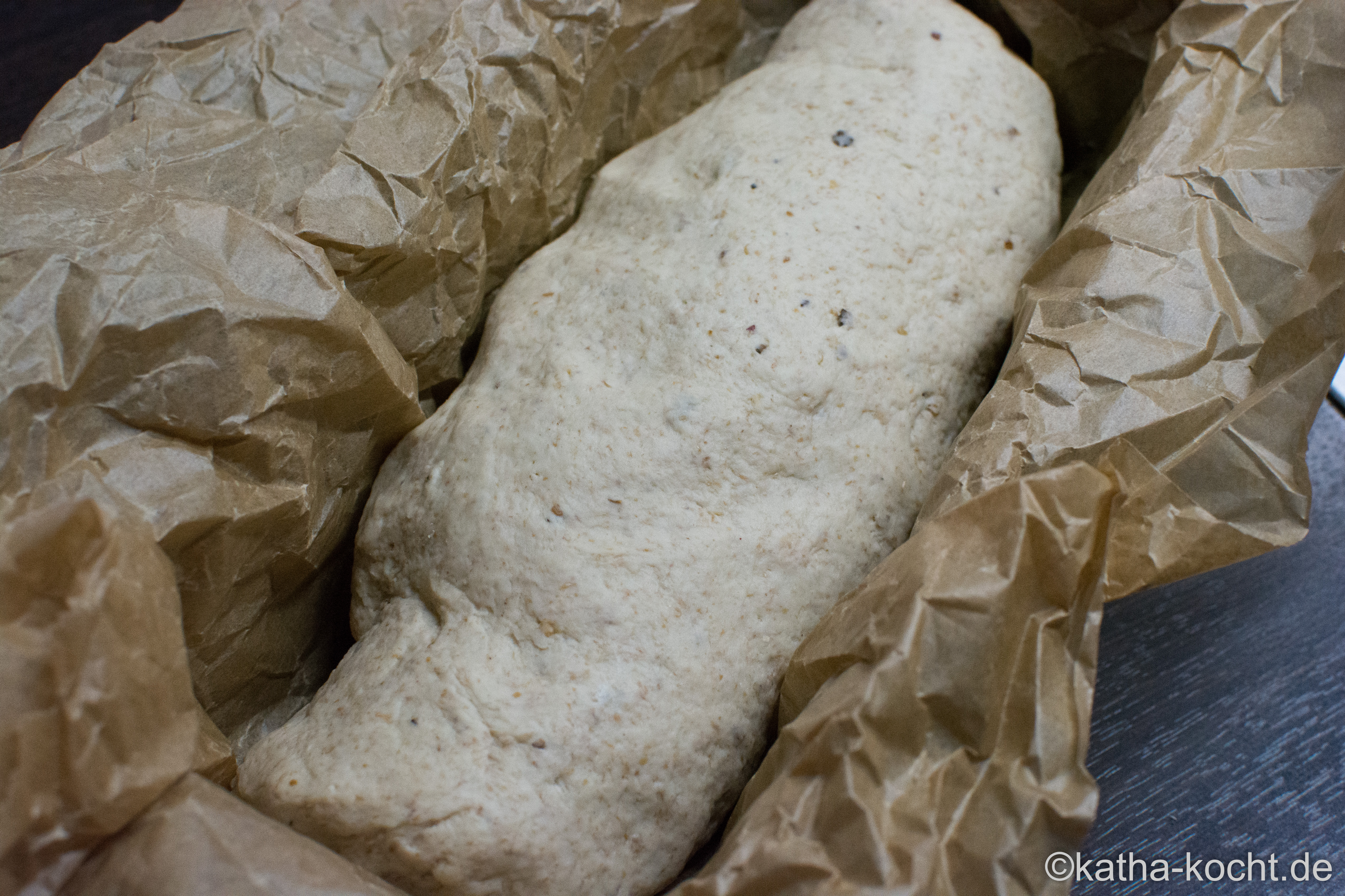 Zuerst die Kastanienflocken und das Wasser in die Rührschüssel geben. Die Flocken quellen sofort auf. Dann alle anderen Zutaten zufügen und alles in der Küchenmaschine 5 Minuten lang auf kleiner Stufe zu einem elastischen Teig verkneten. Den Teig zu einer langen Rolle formen und in die mit Backpapier ausgelegte Backform legen.