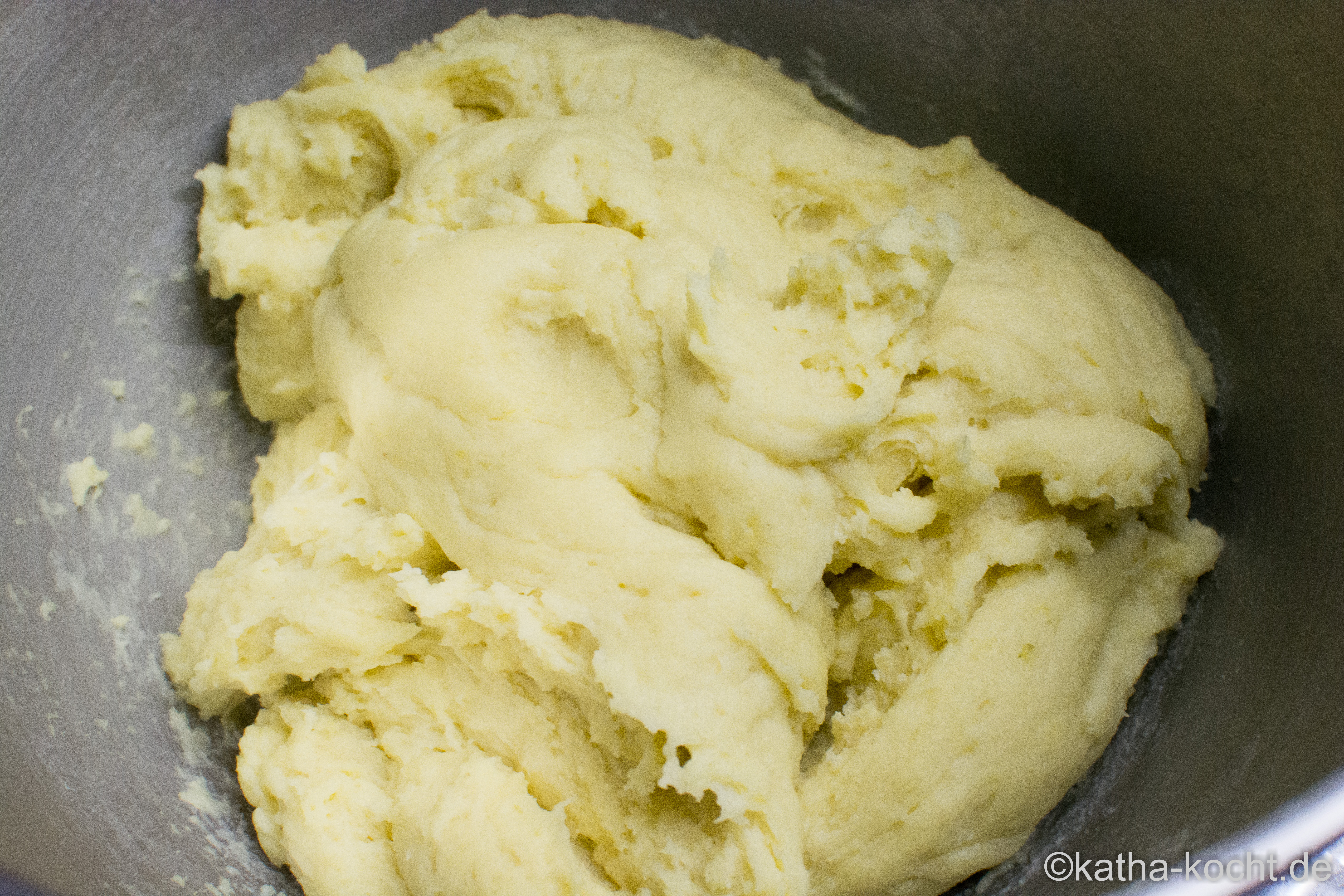 Sobald keine großen Stücken mehr zu sehen sind gebe ich das Ei, das Salz und das Mehl dazu. Wichtig – wenn die Kartoffeln noch zu heiß wären würde das Ei gerinnen! Den Teig mit dem Handrührgerät oder der Küchenmaschine verkneten bis er eine feste, gleichmäßige Konsistenz hat.