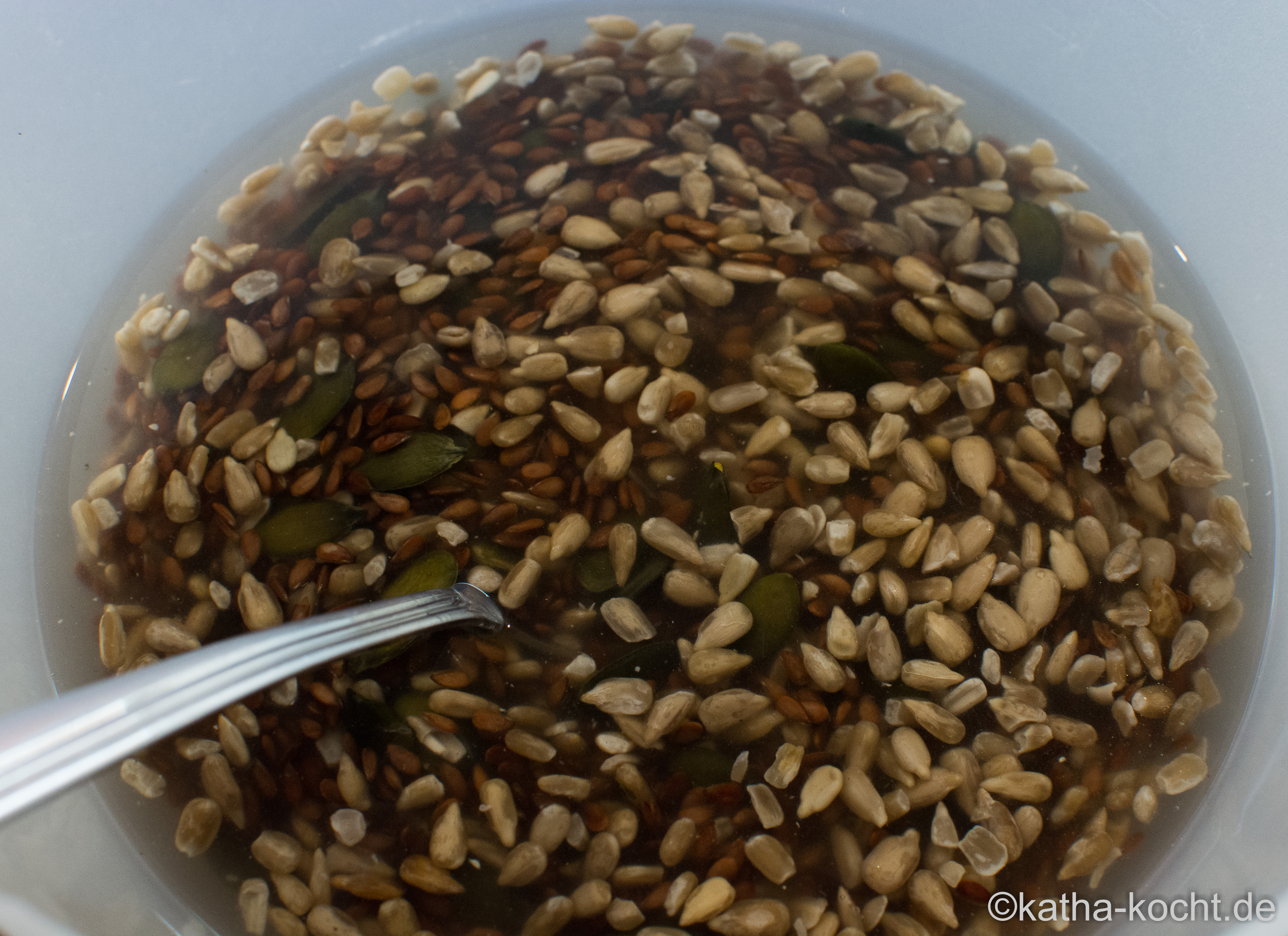 Kürbiskerne, Leinsamen und Sonnenblumenkerne in eine Schüssel geben und mit dem kochenden Wasser übergießen. Abkühlen lassen bis das Ganze Raumtemperatur hat.