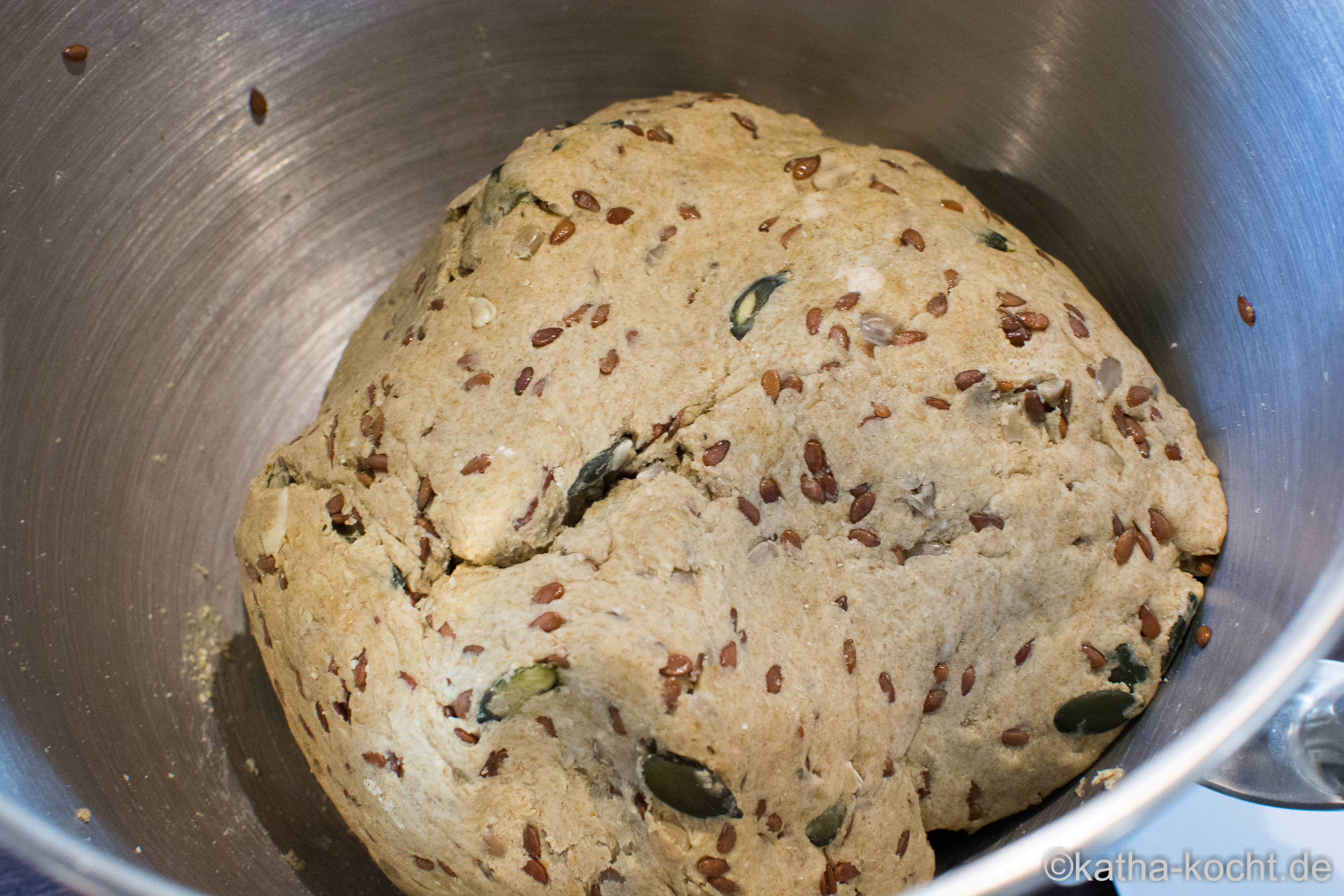 … und alles auf mittlerer Stufe 5 Minuten lang zu einem festen, nicht mehr klebenden Teig verkneten.