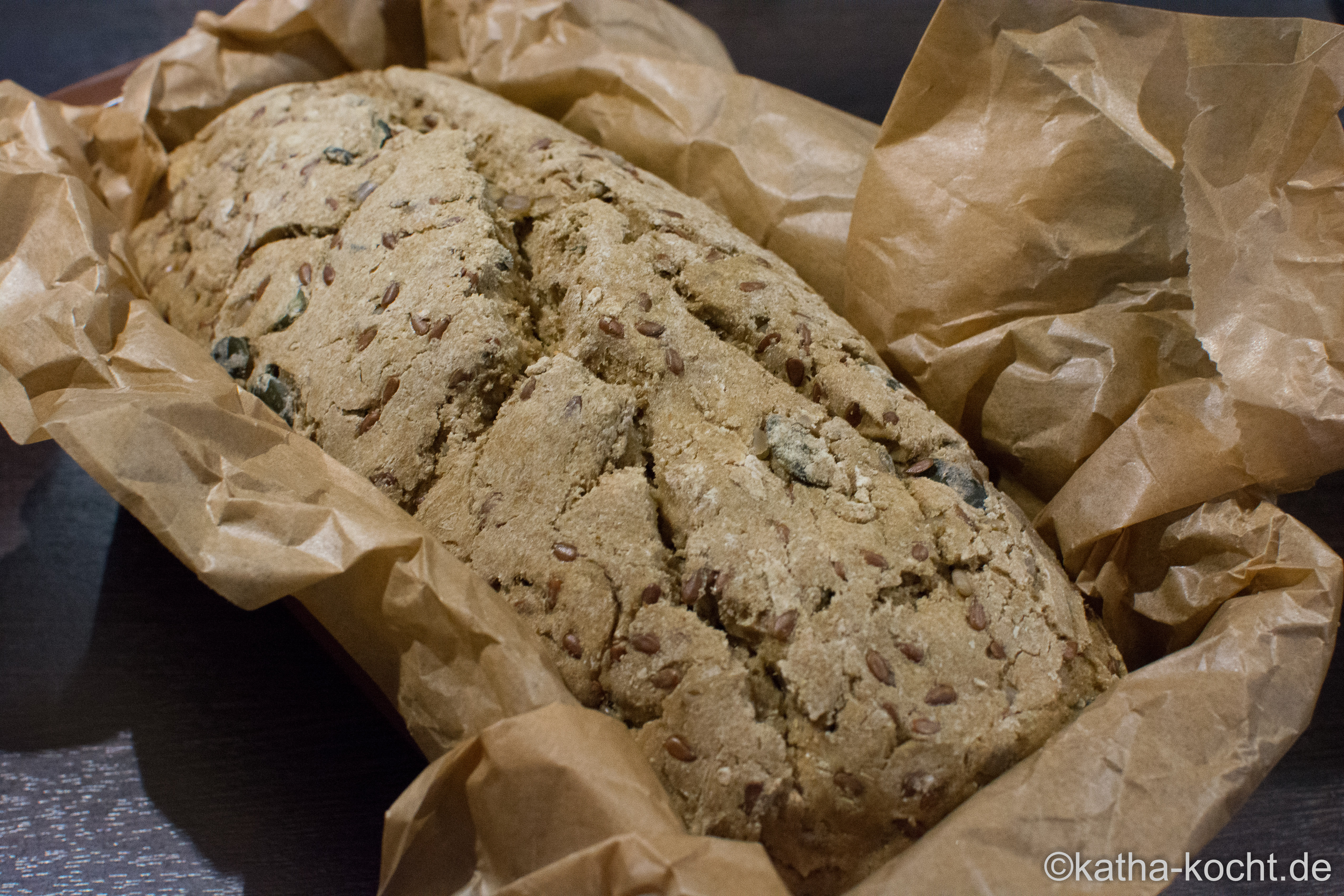 Den Teig 2 Stunden gehen lassen, auf der ganz leicht bemehlten Arbeitsplatte 3-4 mal falten bis er eine längliche Form hat und in die mit Backpapier ausgelegte Kastenform geben.