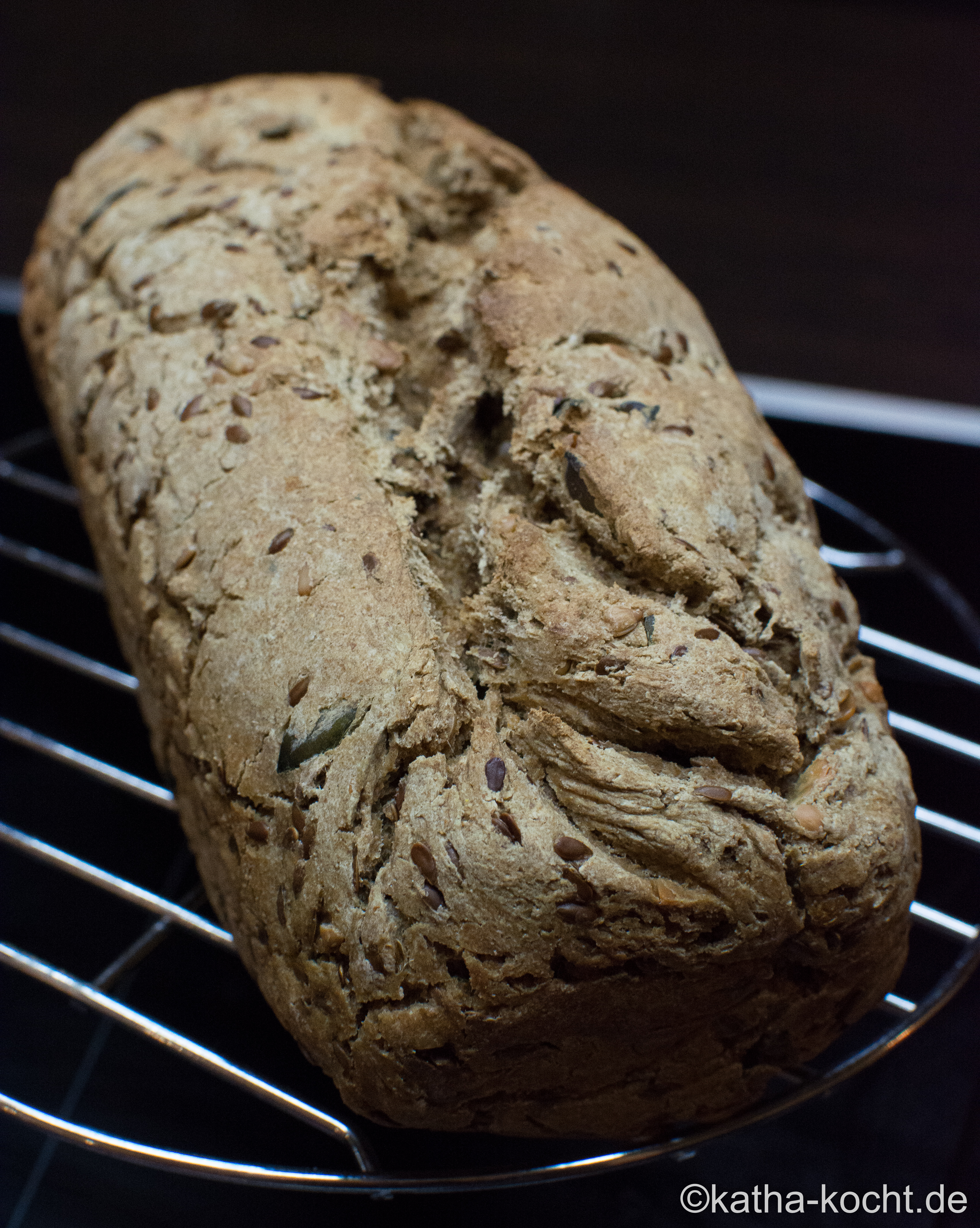 Nochmal 45 Minuten gehen lassen und den Backofen auf 230°C mit Schwaden vorheizen. Die Backform auf einem Gitter in den Ofen schieben. 20 Minuten backen, dann das Brot auf dem Backpapier aus der Form heben und zurück auf das Gitter setzen. Die Hitze auf 180°C reduzieren und das Brot 30 Minuten lang fertig backen. Danach darf es auf einem Gitter vollständig auskühlen.
