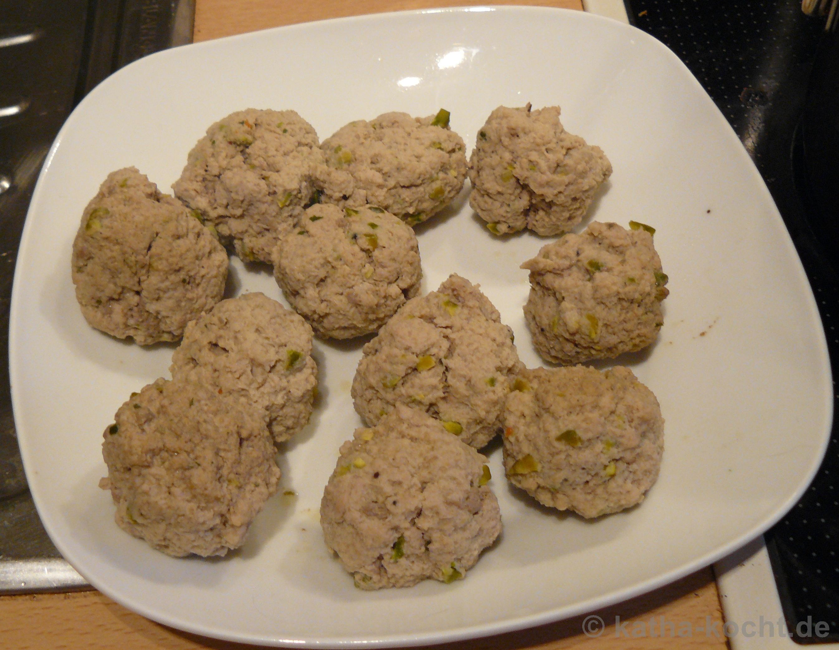 Unter die Farce habe ich dann die gehackten Pistazienkerne gemischt und das Ganze mit Pfeffer und Salz abgeschmeckt.