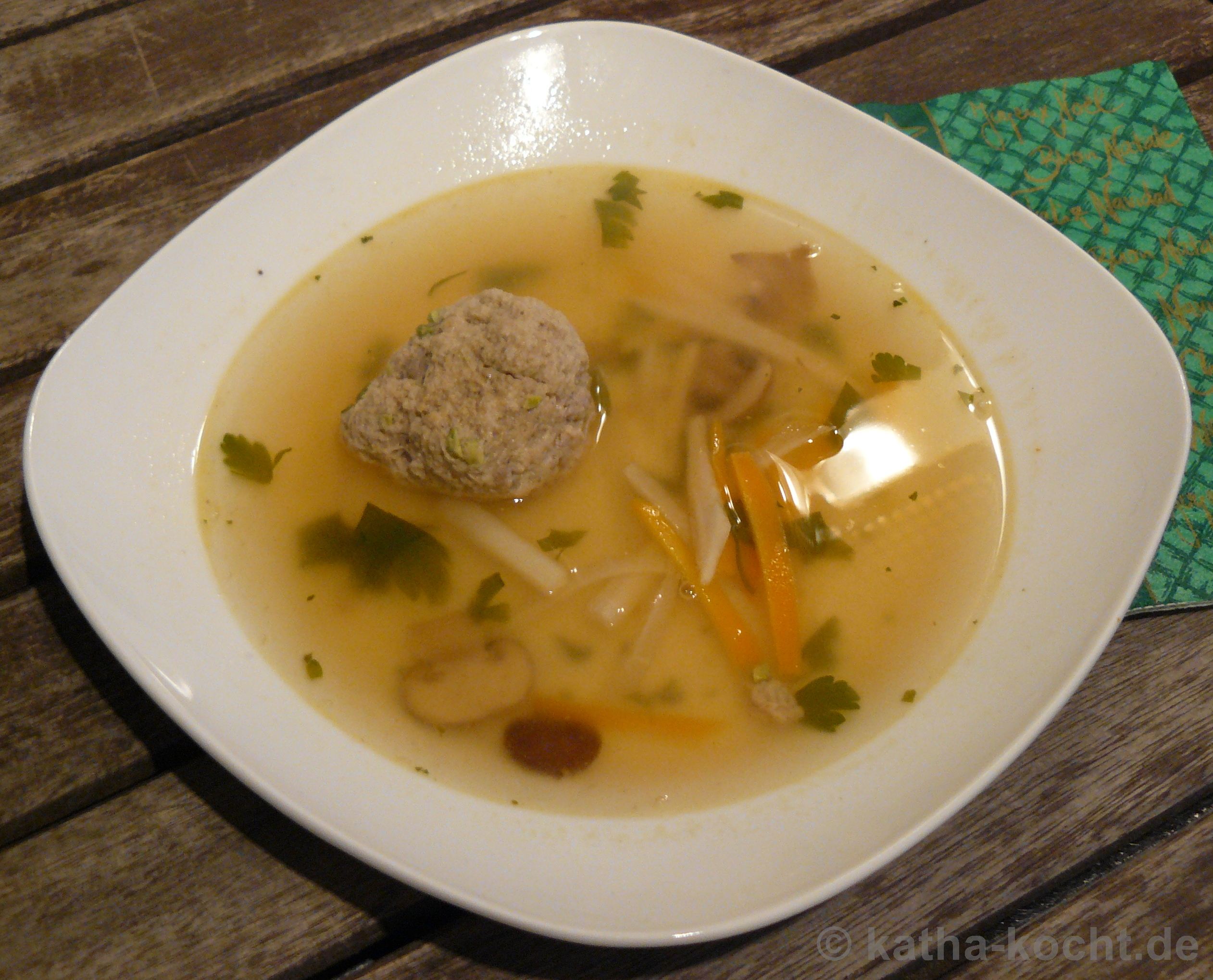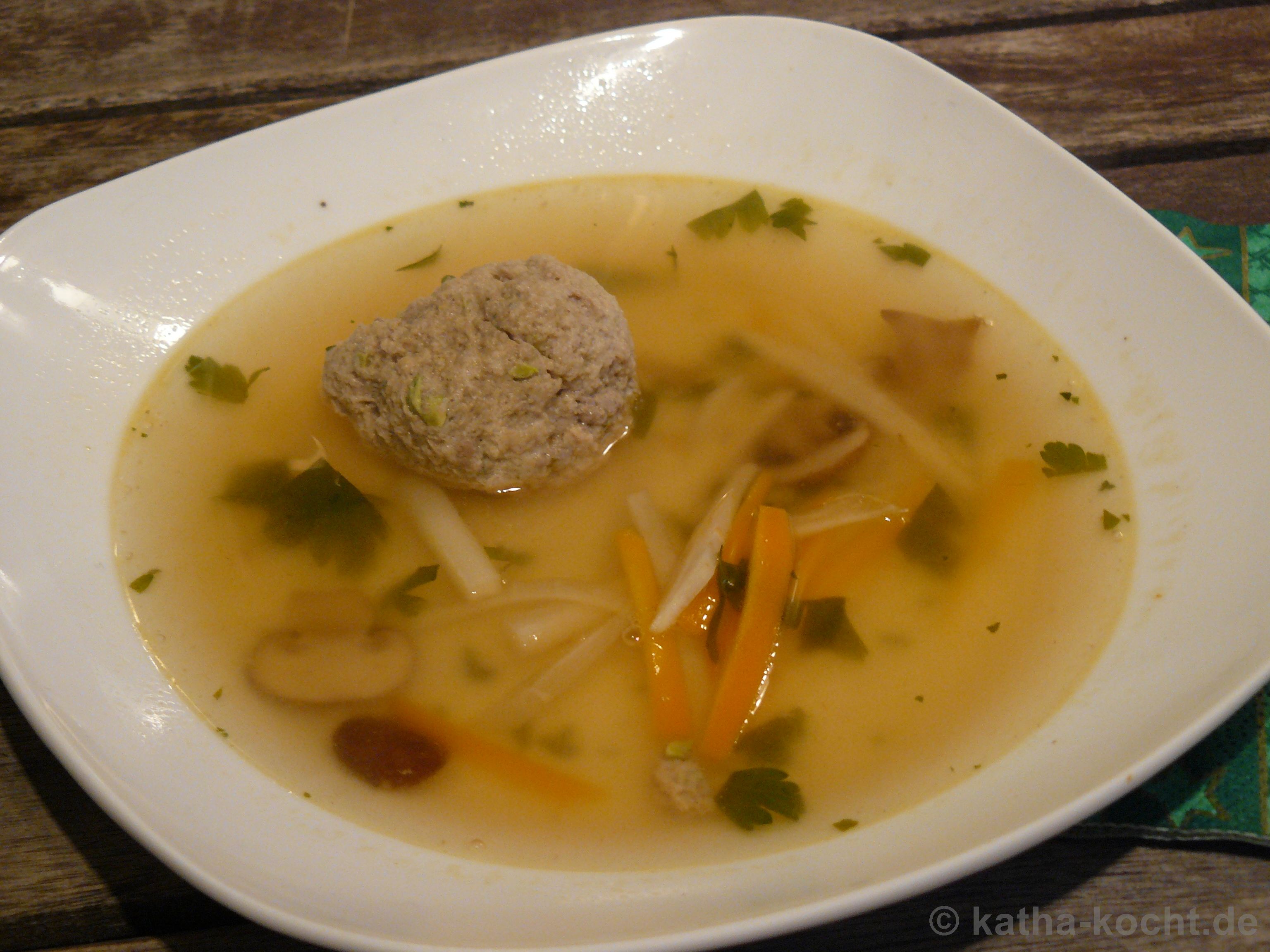 Die Bällchen habe ich beiseite gestellt bis die Gäste da waren. Die Bällchen sollten auf keinen Fall in der richtigen Suppe aufgekocht werden. Fleisch und Sahne haben die Brühe extrem getrübt. Das wäre nicht so appetitlich gewesen.