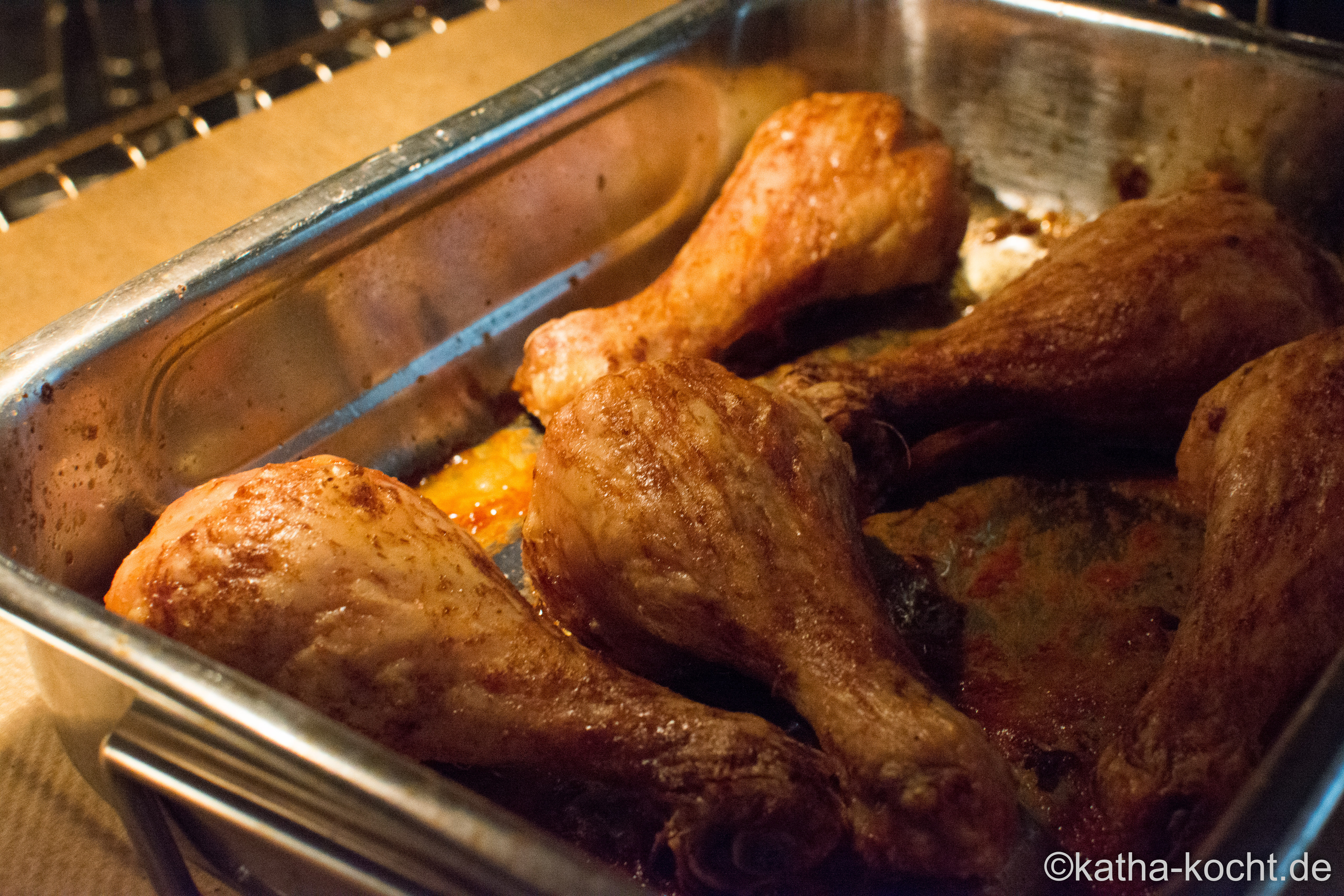 Salz und Öl vermischen und die Hähnchenschenkel rundum damit einreiben. Den Backofen auf 180°C vorheizen und die Hähnchenschenkel in einer kleinen Auflaufform für 25 Minuten in den Backofen schieben. Ab und an mit etwas ausgetretener Flüssigkeit einpinseln, nur so wird die Haut schön knusprig.