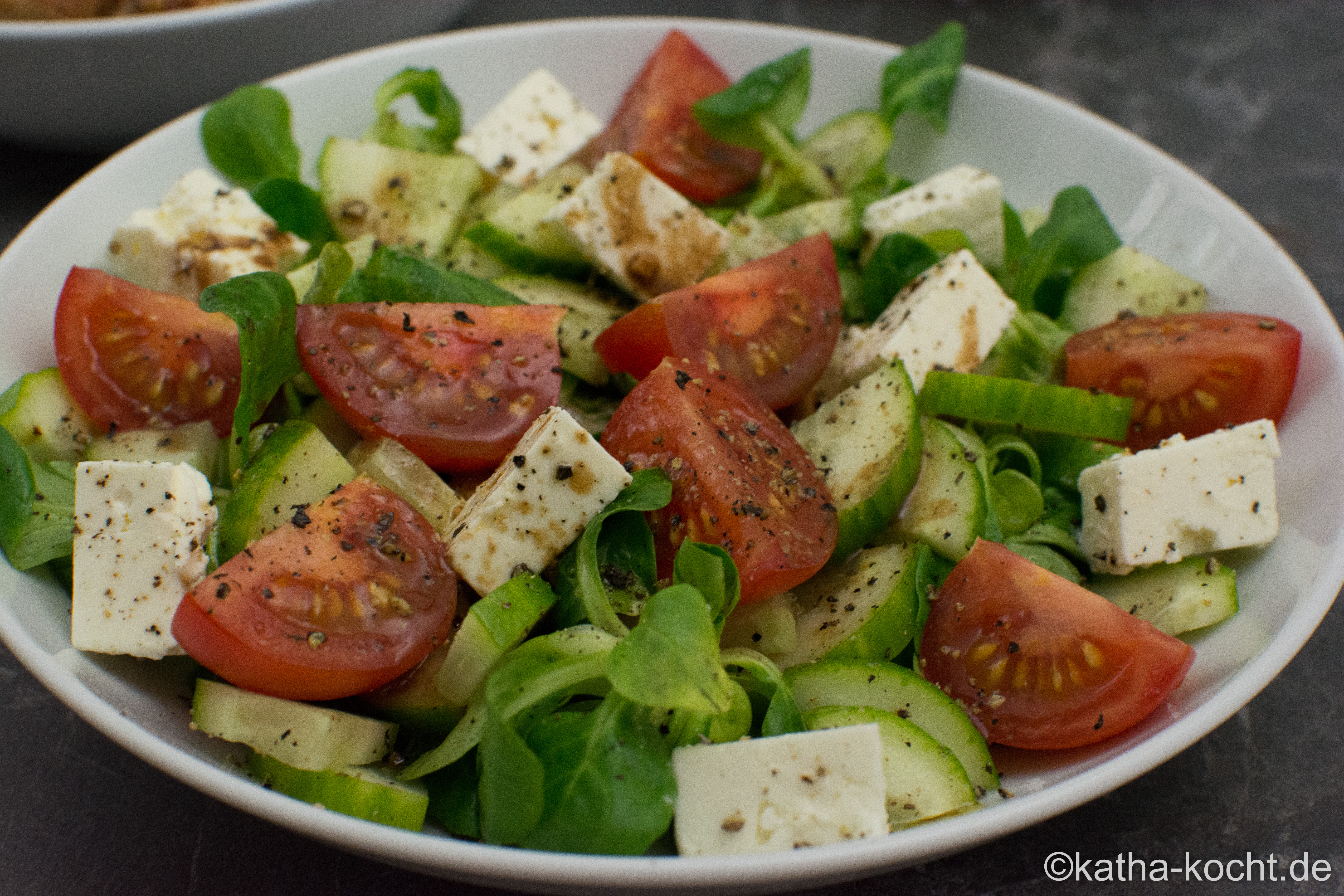 Den Feldsalat waschen, die Gurke der Länge nach vierteln und in Stücken schneiden. Den Schafskäse würfeln und die Tomaten vierteln.