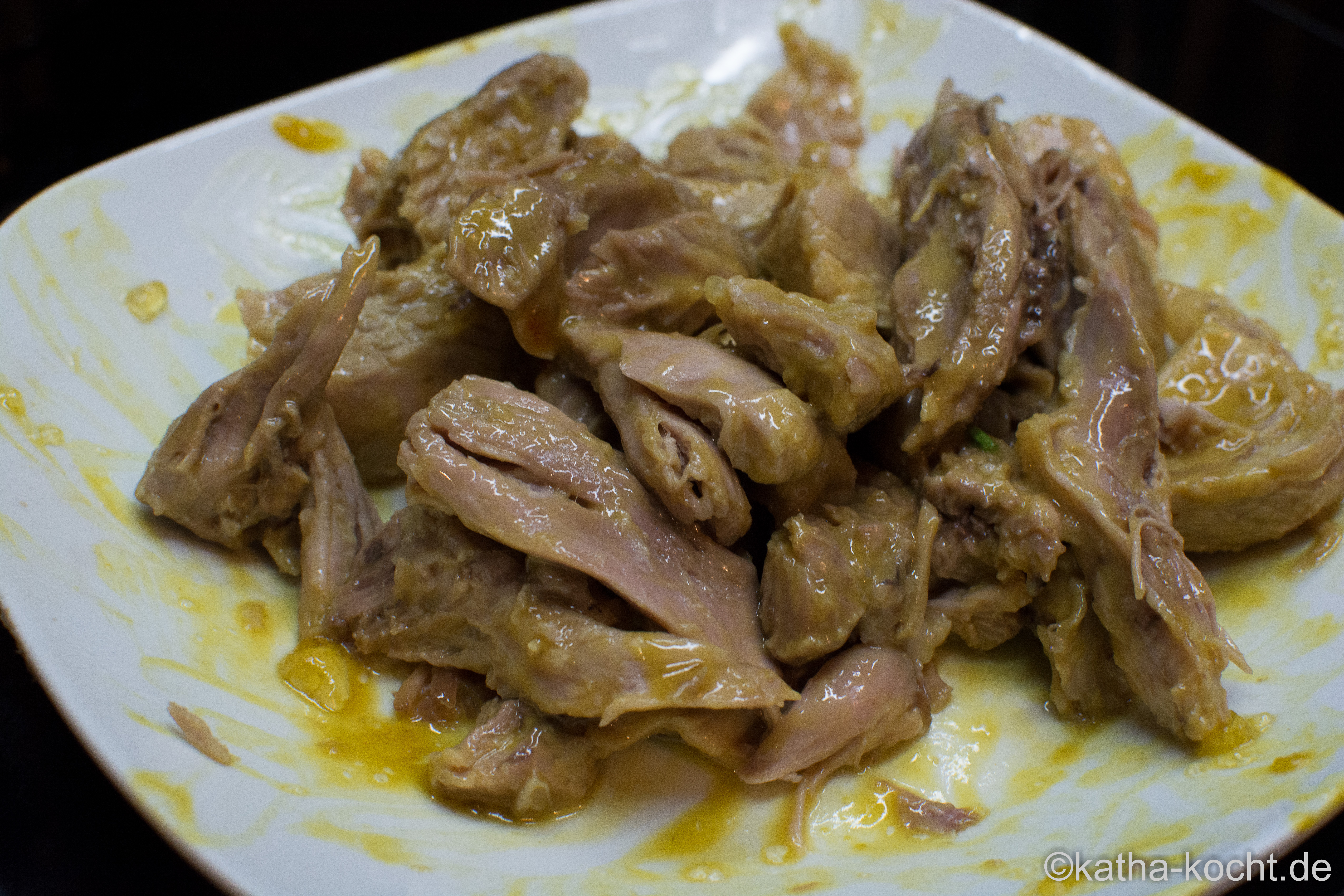 Das Fleisch kurz etwas abkühlen lassen und dann vom Knochen lösen. In kleine Stücken zupfen. Die Marmelade mit dem Senf vermischen und das Fleisch damit vermengen.