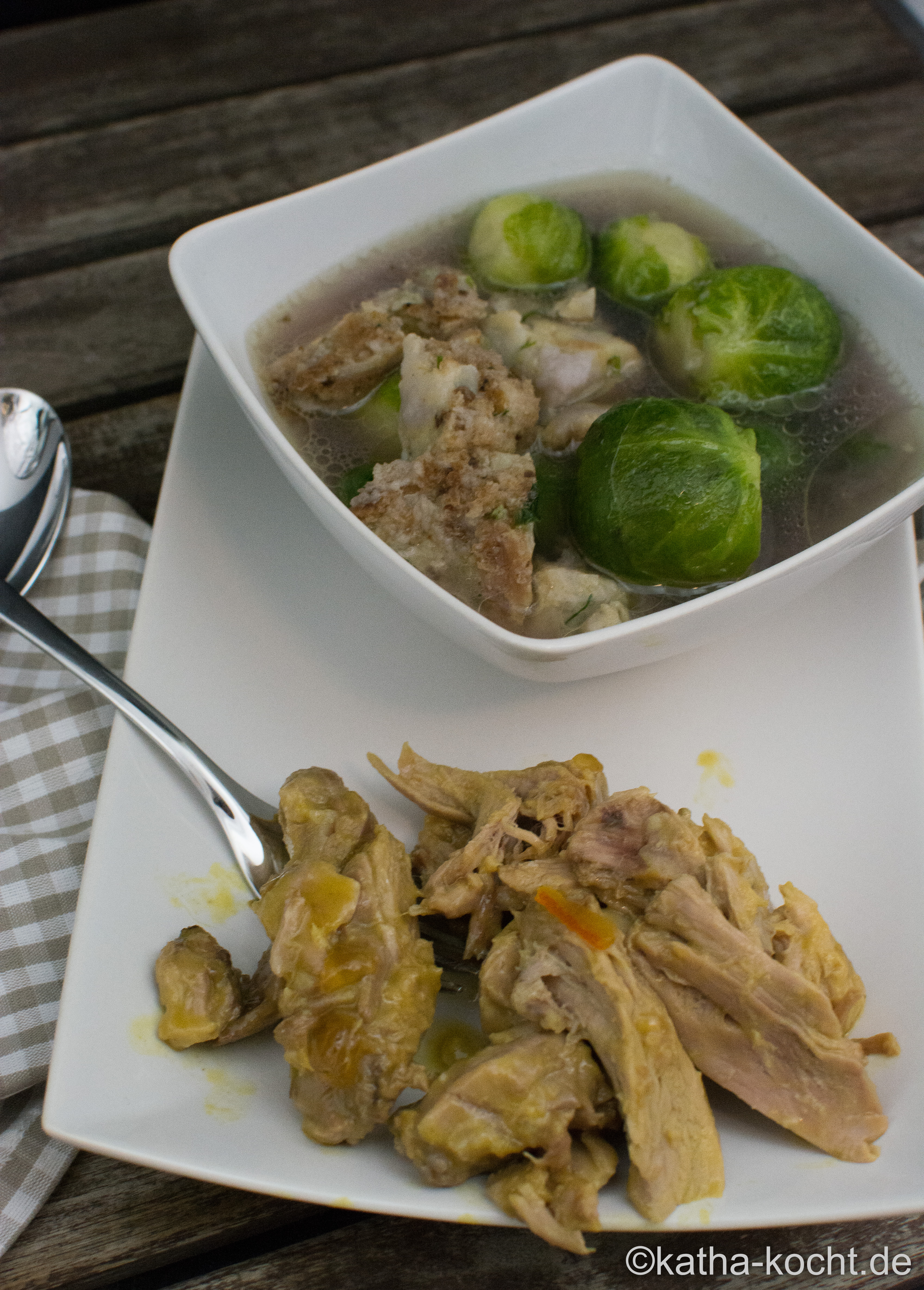 Die Rosenkohlröschen vom Strunk befreien, die äußeren Blätter entfernen und die Röschen halbieren. Die Suppe aufkochen, den Rosenkohl hinein geben und in etwa 5-7 Minuten kochen bis die Röschen gar sind. Auf die letzten 1-2 Minuten den klein gewürfelten Knödel dazu geben. Ich hatte den Rosenkohl hier nicht halbiert und das war Mist – er ist nämlich in der Mitte ewig heiß geblieben.