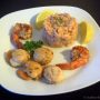 Auf einem großen Teller die Garnelen, die Muscheln und das Lachs Ceviche anrichten. Für die Jacobsmuscheln noch 2 Spalten Zitrone auf den Teller legen und das Lachs Ceviche mit etwas Dill bestreuen. Es sieht auch sehr hübsch aus, wenn die Riesengarnelen paarweise „herzförmig“ angerichtet werden.