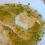 Die Rindersuppe gieße ich durch ein Sieb, das Gemüse kommt weg, die Suppe wird mit Pfeffer und Salz abgeschmeckt. Dazu kommt die in feine Ringe geschnittene Frühlingszwiebel und die fein gehackte Petersilie.