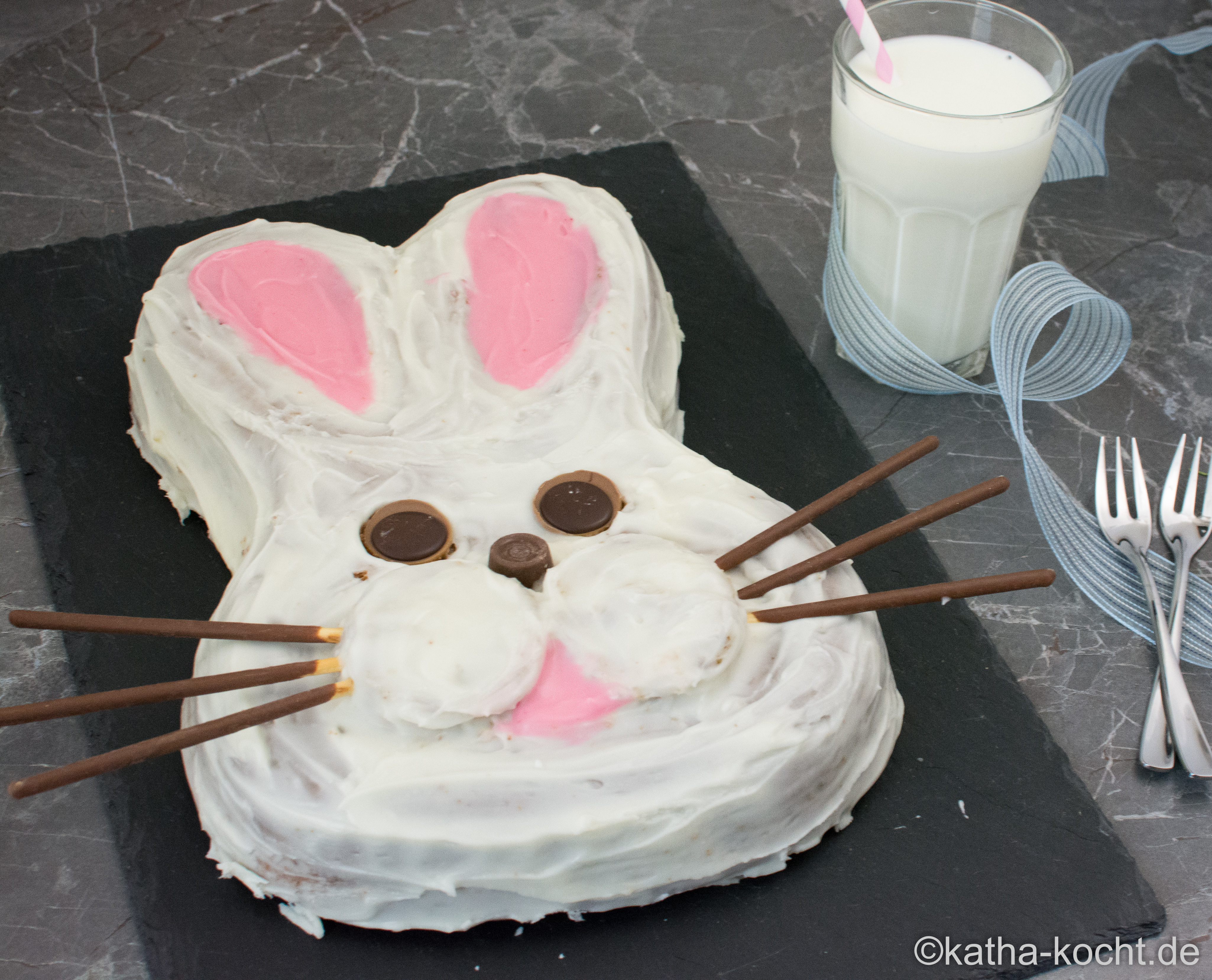 Den Osterhasen Kuchen rundum mit Frosting einstreichen, dabei ca. 2 EL Frosting als Rest übrig behalten.
