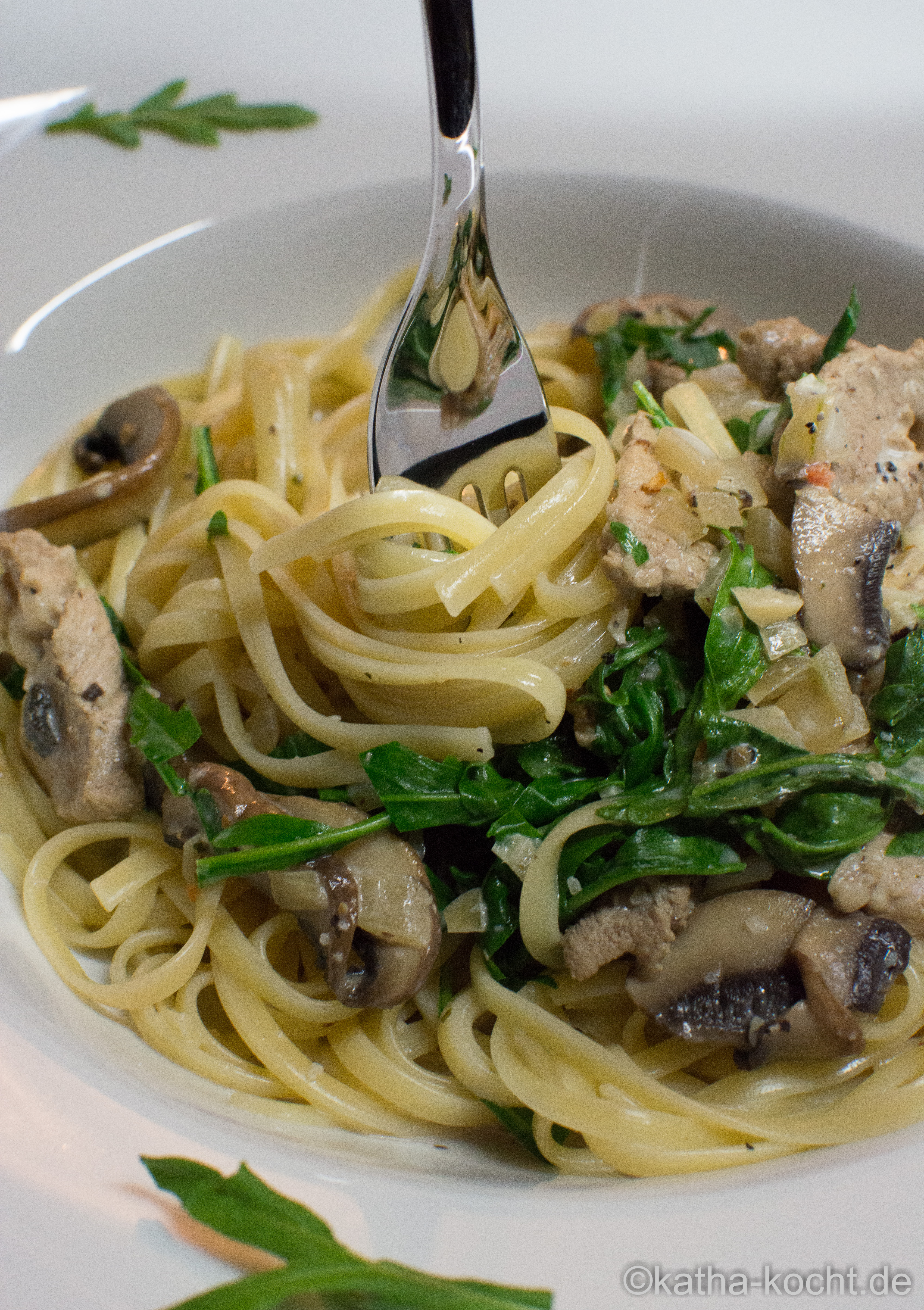 Pasta mit Schweinefilet und Rucola in Weißwein-Sahnesauce