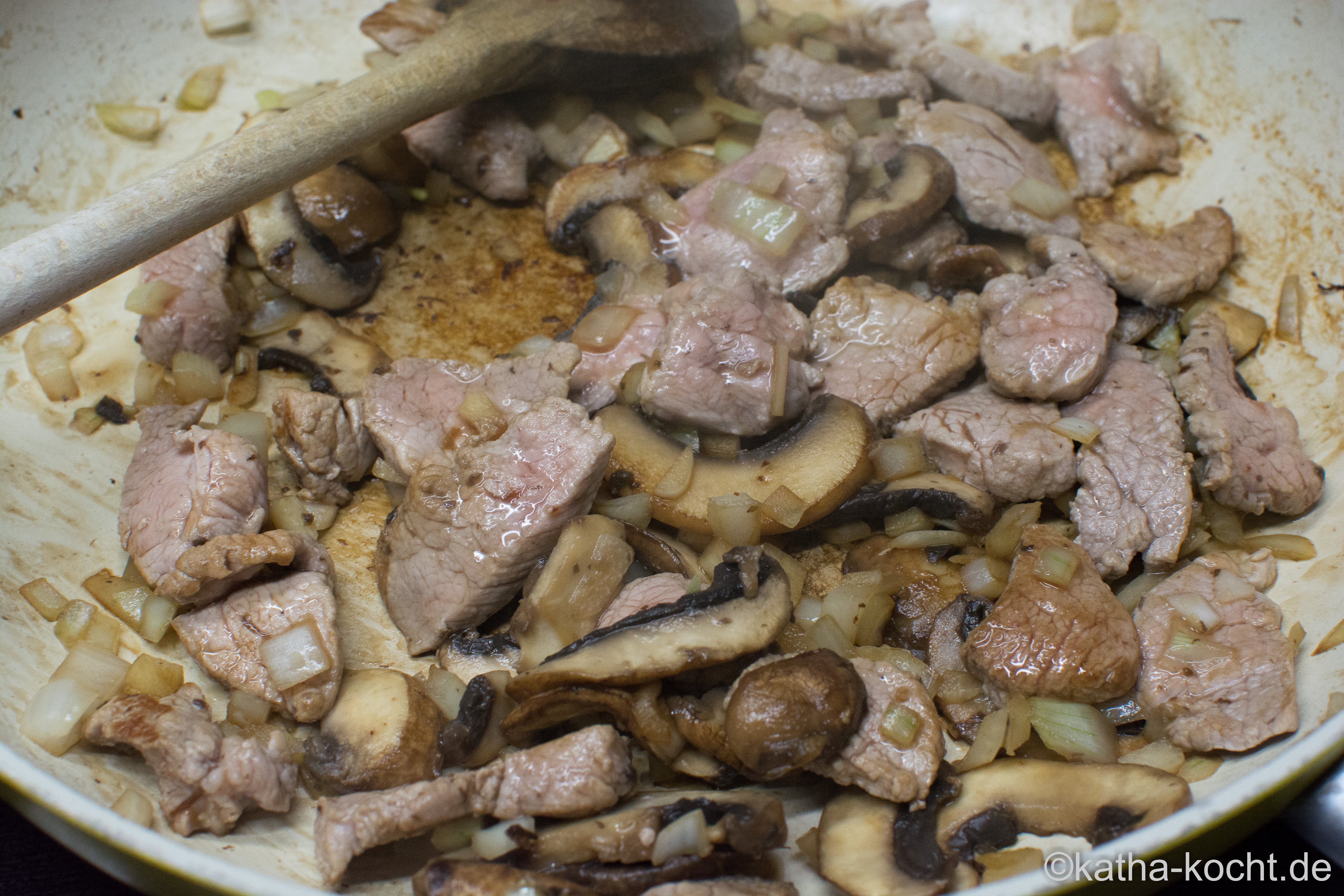 Ich setze einen Topf Salzwasser für die Nudeln auf und starte direkt mit der Sauce. Das Olivenöl in einer großen Pfanne erhitzen und die Pilze darin anbraten. Sobald sie etwas Farbe bekommen kommen die fein gewürfelten Zwiebeln und der Knoblauch dazu geben. Weiter anschwitzen bis die Zwiebeln glasig werden, dann darf auch das gewürfelte Schweinefilet dazu. Mit Pfeffer und Salz würzen.