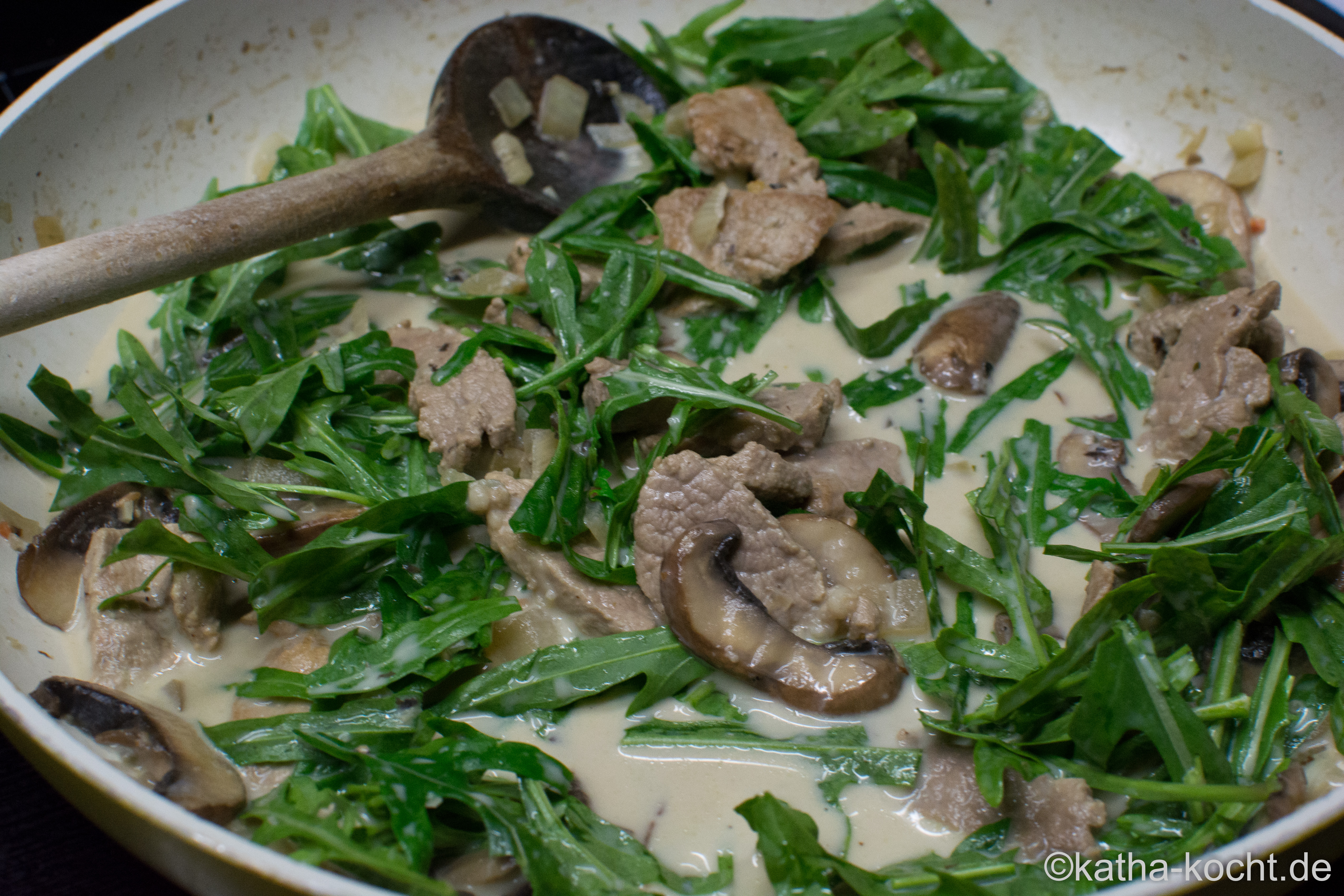Sobald die Pilze und das Fleisch etwas Farbe bekommen haben lösche ich das Ganze mit dem Wein ab. Gut durchschwenken. Dann kommt jetzt der Weißwein in die Pfanne der ebenfalls fast vollständig reduzieren darf. Als letztes darf dann die Brühe in die Pfanne. Die Hitze sollte reduziert werden, bei mir auf Stufe 5 von 9. Dann rühre ich die Schlagsahne in die leicht erhitzte Brühe ein. Auf die letzte Minute kommt dann der Rucola dazu.