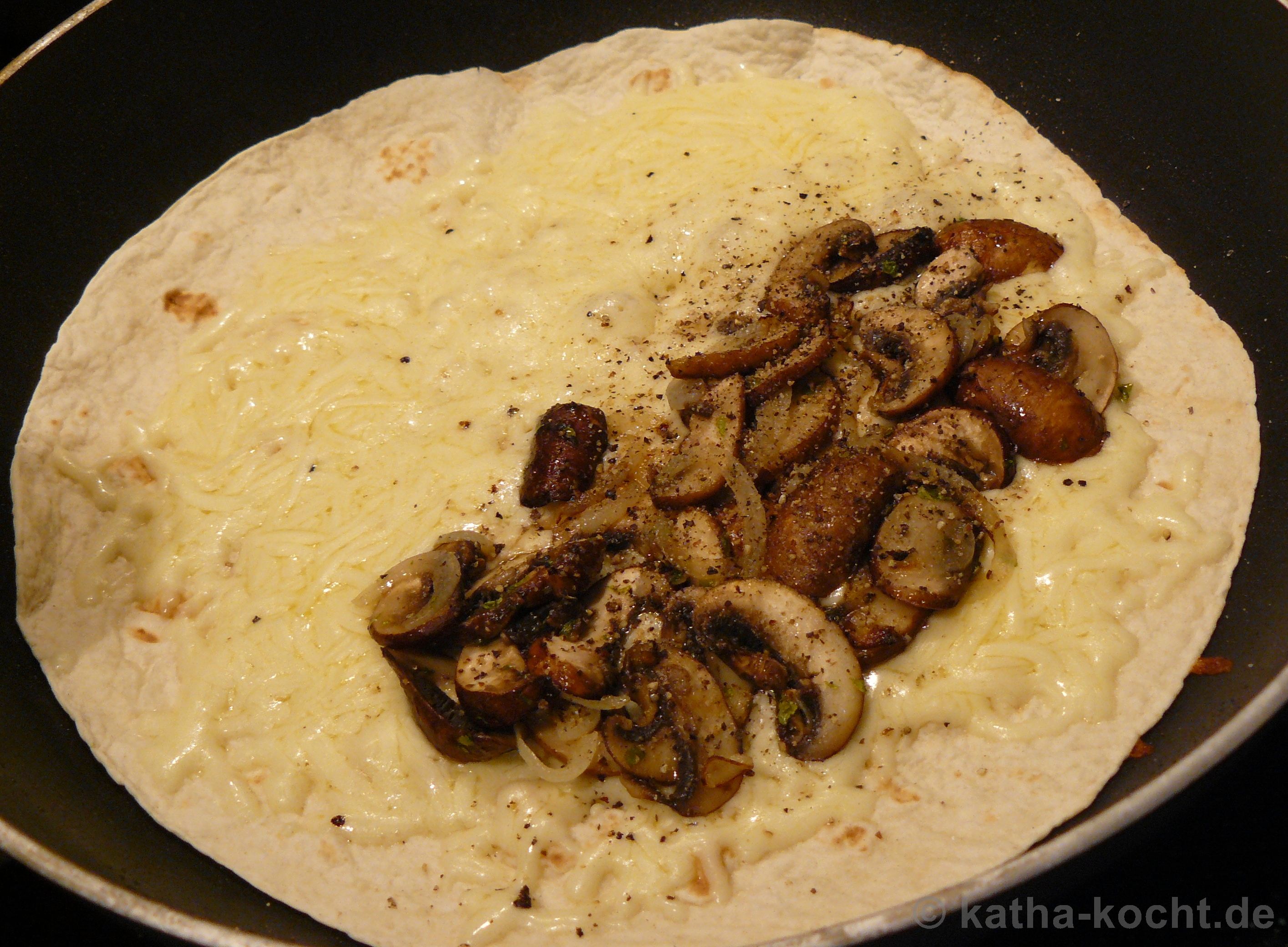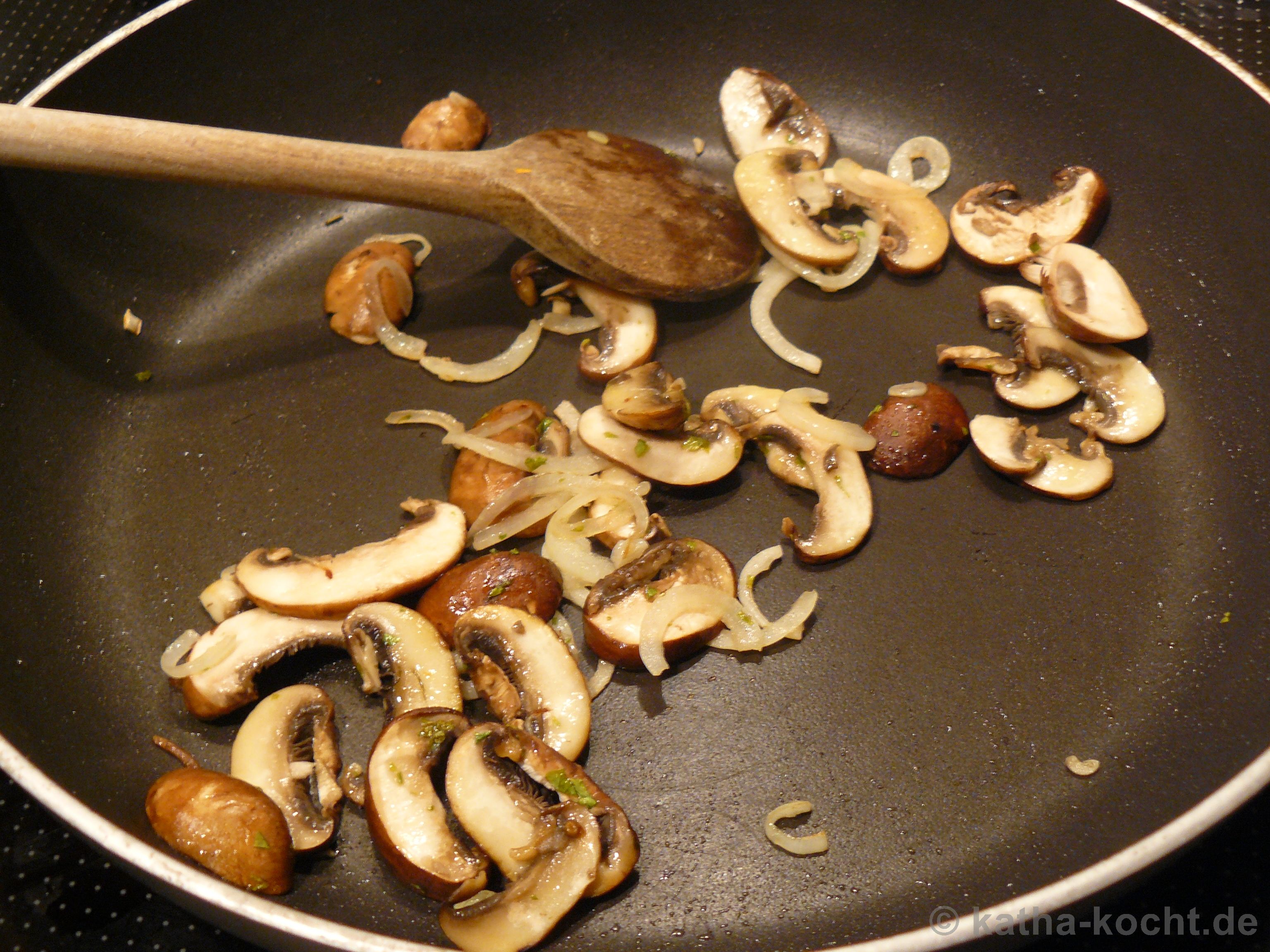 Ich schneide die Champignons in dünne Scheiben und die Zwiebel in halbe Ringe. Beides wird in der Pfanne mit einem kleinen Schluck Olivenöl angebraten bis die Zwiebeln glasig sind und die Pilze etwas Farbe angenommen haben. Mit Pfeffer und Salz würzen. Aus der Pfanne nehmen und kurz beiseite stellen.