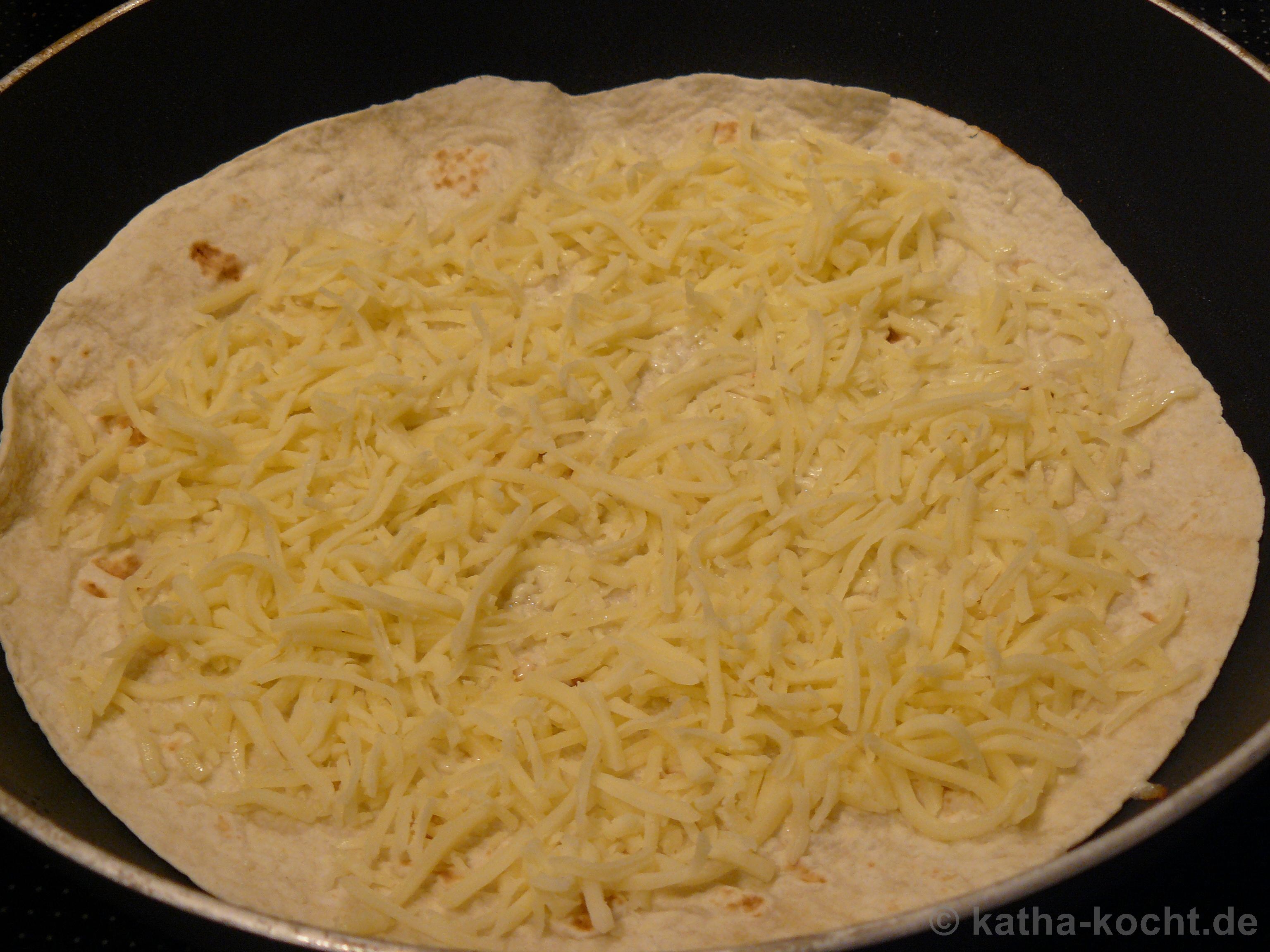 Jetzt lege ich eine Tortilla in die Pfanne und bedecke sie auf der ganze Fläche mit geriebenem Mozzarella. Wer mehr als eine Tortilla macht sollte jetzt am Besten mit zwei Pfannen parallel arbeiten. Die Hitze sollte nicht zu hoch sein (hier Stufe 6 von 9).