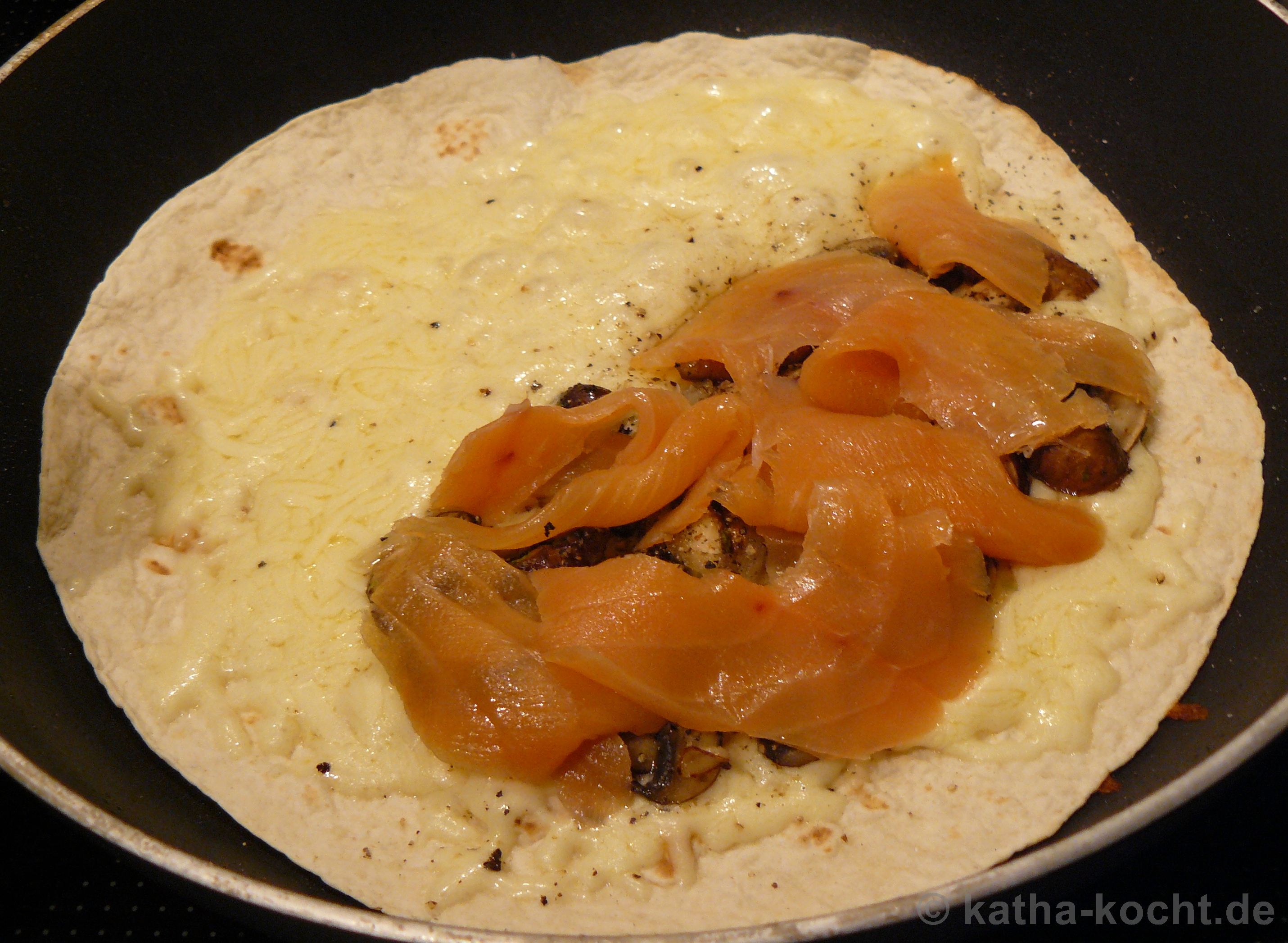 Sobald der Käse schmilzt gebe ich auf eine Hälfte der Tortilla die Champignons. Darauf kommt der Raücherlachs. Ich zupfe die Lachsscheibchen dafür ein bissl klein.