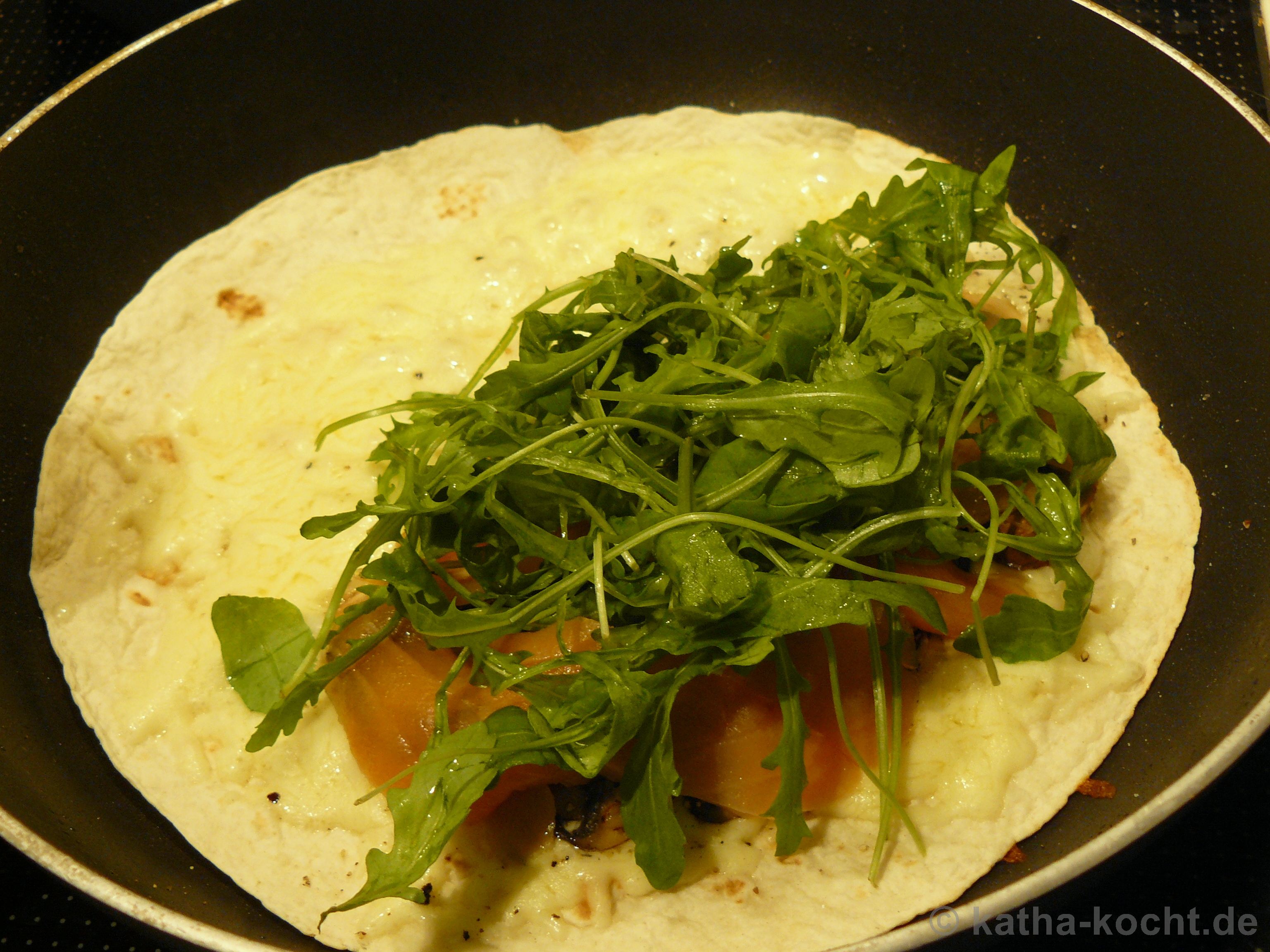 Dann wird alles unter Rucola versteckt und die Tortilla zugeklappt.