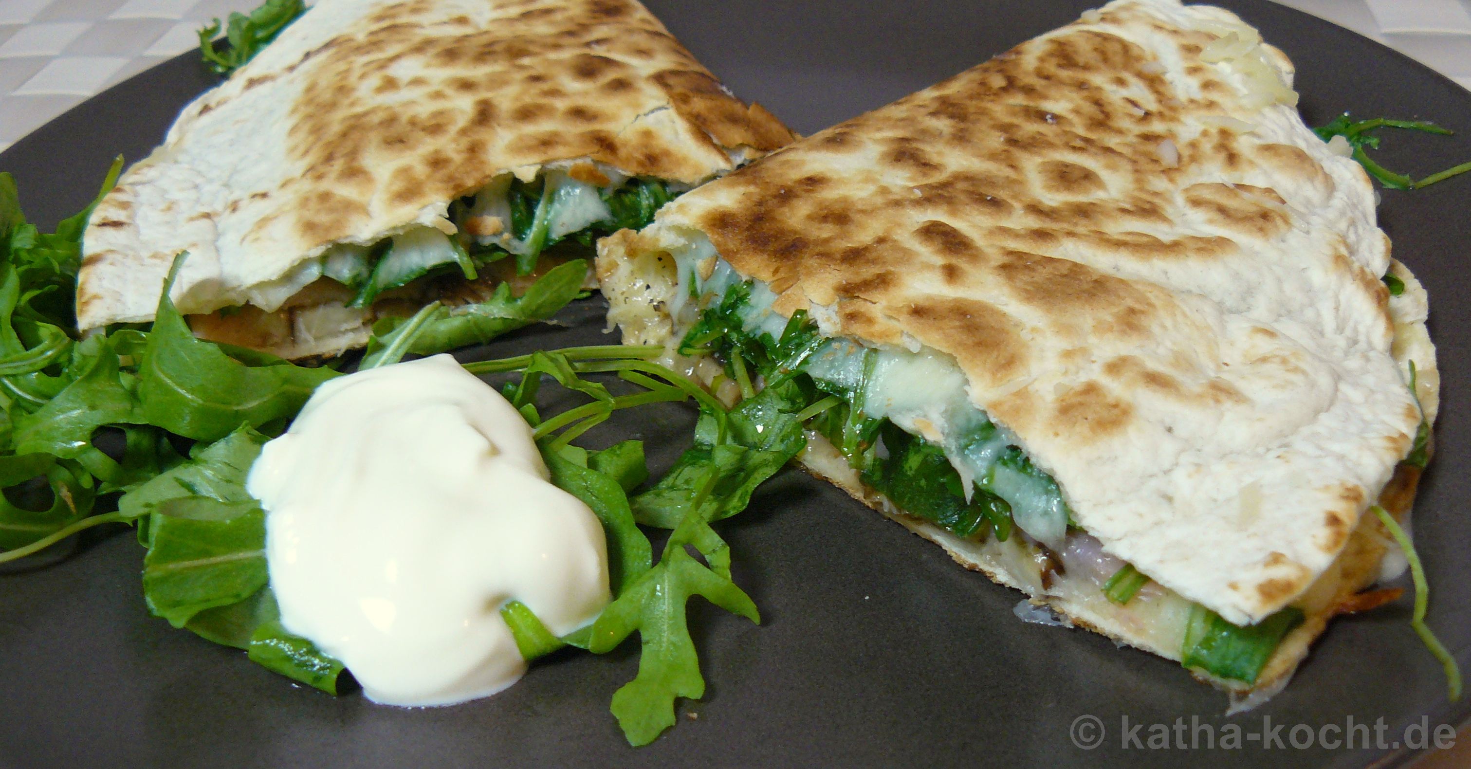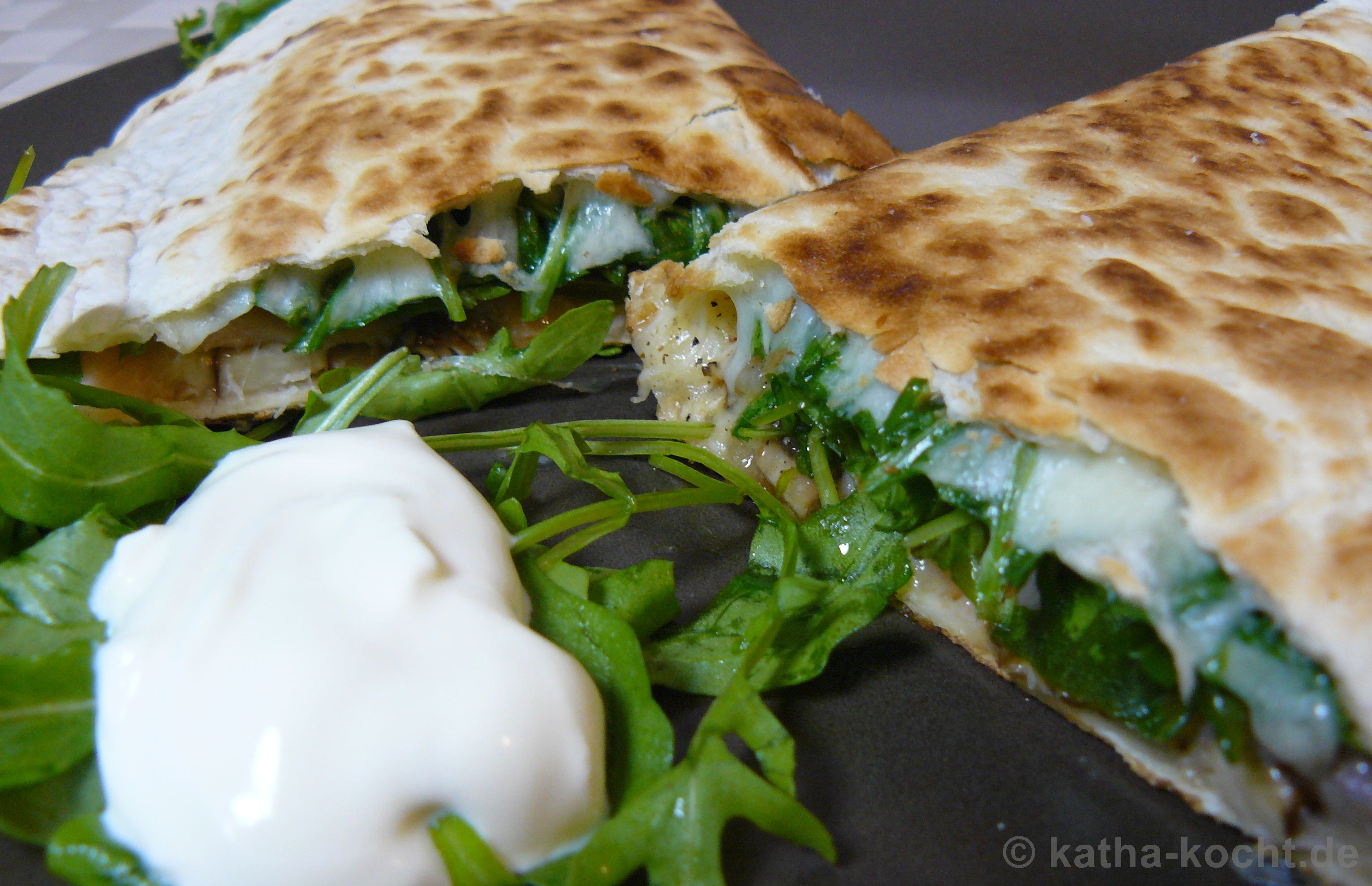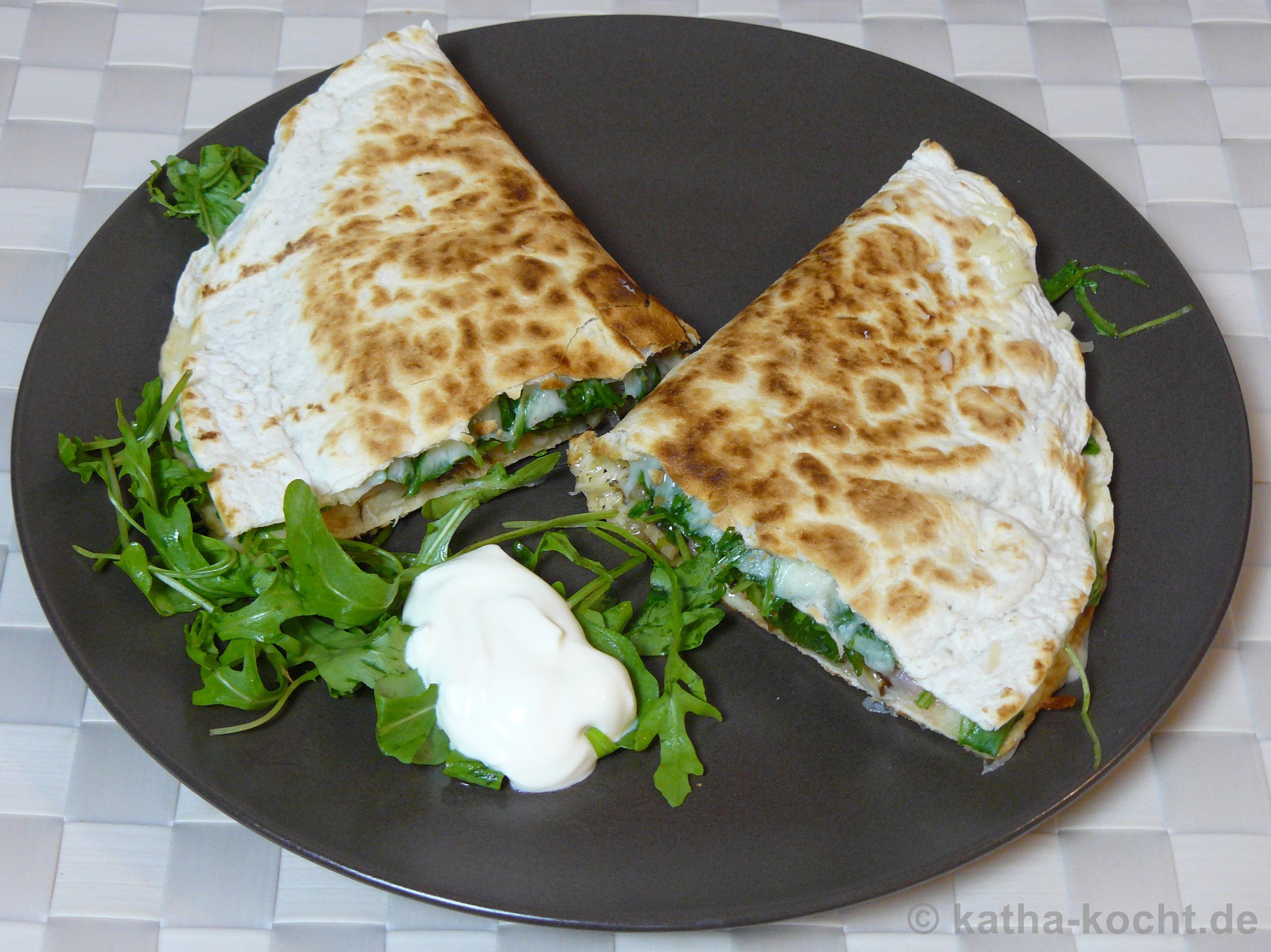 Im letzten Schritt wird die Quesadilla vorsichtig aus der Pfanne gehoben und halbiert. Ich finde so sieht sie netter aus. Mit etwas Rucola und einem Löffelchen Créme fraîche anrichten. Ein Meerrettich-Dip würde aber auch gut passen.
