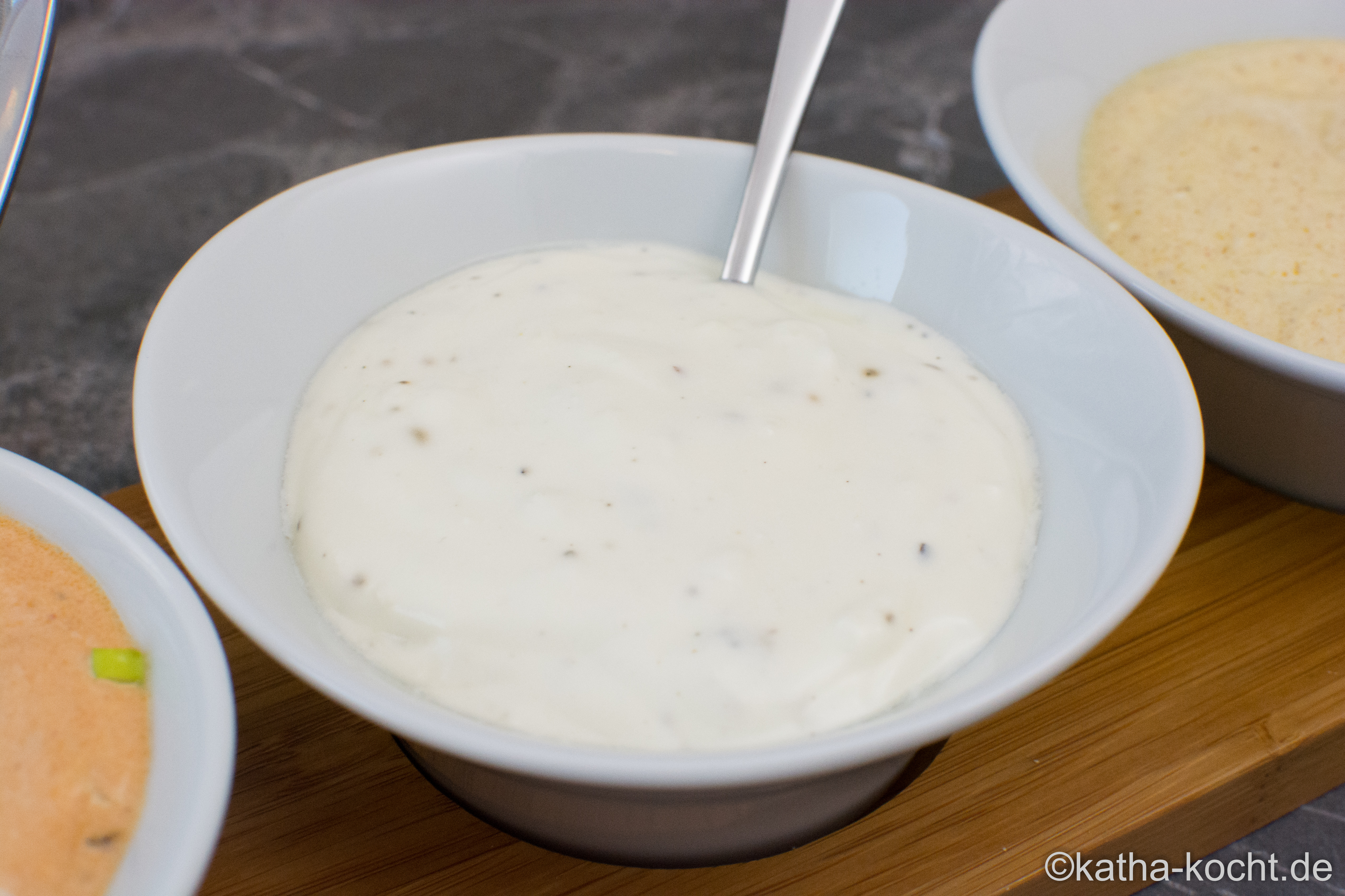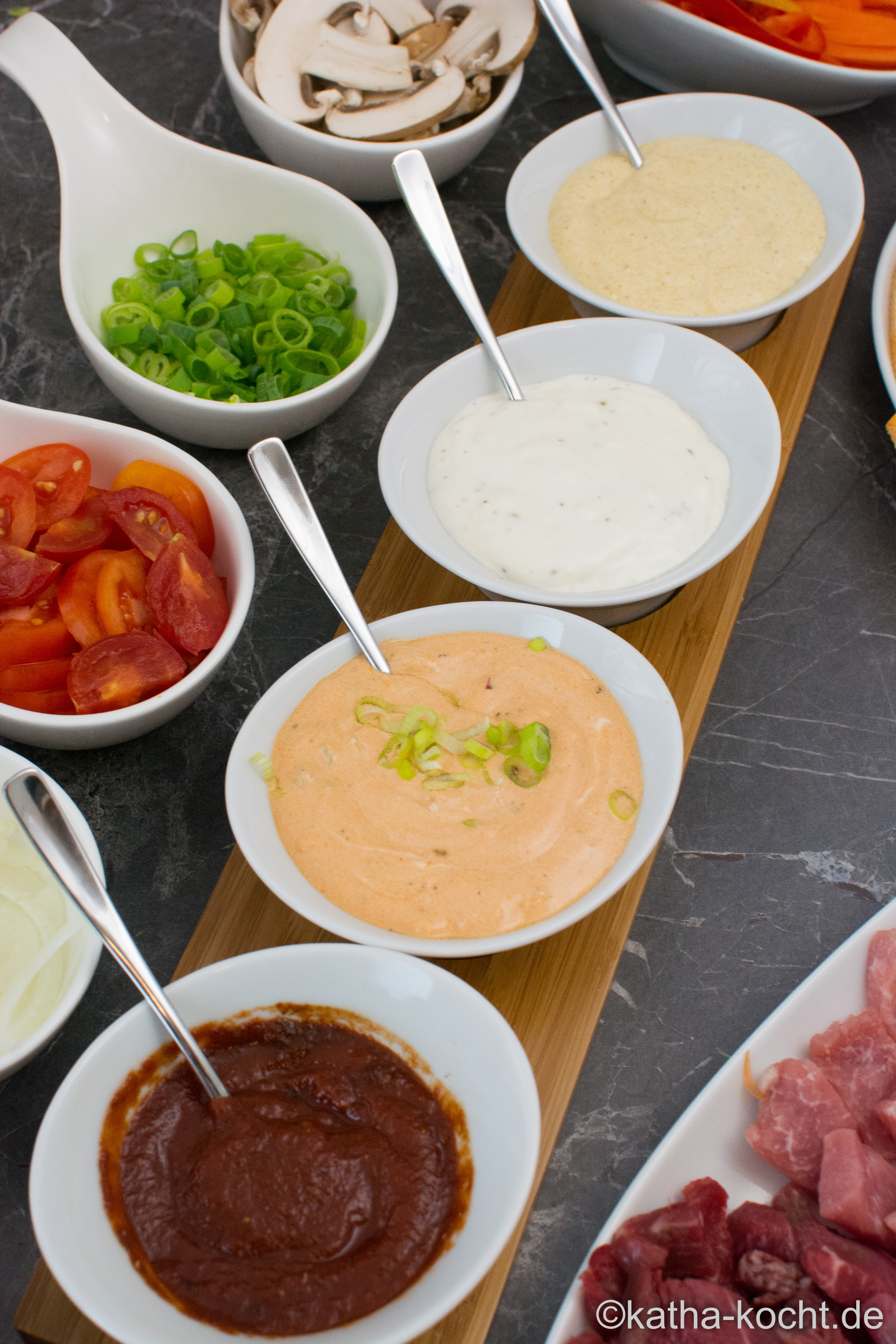 das ist ja ähnlich wie bei uns – ich hatte Kräuter-, California-, Meerrettich- und Preisselbeer Dip.