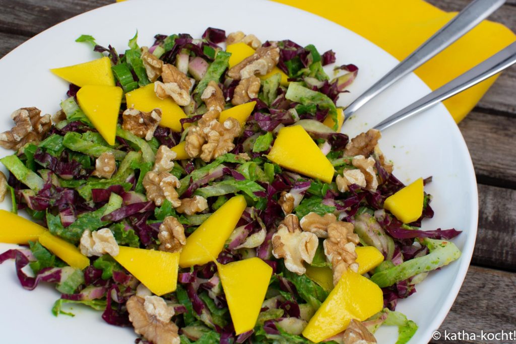 Radicchio polarisiert ja immer ein wenig – ist er nun zu bitter oder nicht? Ich schwanke da ja auch immer mal wieder, aber in diesem Rezept bildet die süße Mango einen ganz wunderbaren Kontrast. Das Ganze wird mit einem scharfen Chili-Dressing und ein paar knackigen Walnüssen abgerundet. Somit ist dieser Radicchio-Mangosalat mit Walnüssen ein perfekter Sommersalat der auch als Hauptgericht keine Wünsche offen lässt. Die Inspiration dazu habe ich aus der „Lecker – Healthy“, habe das ganze aber noch ein bisschen „punktefreundlicher“ gestaltet.