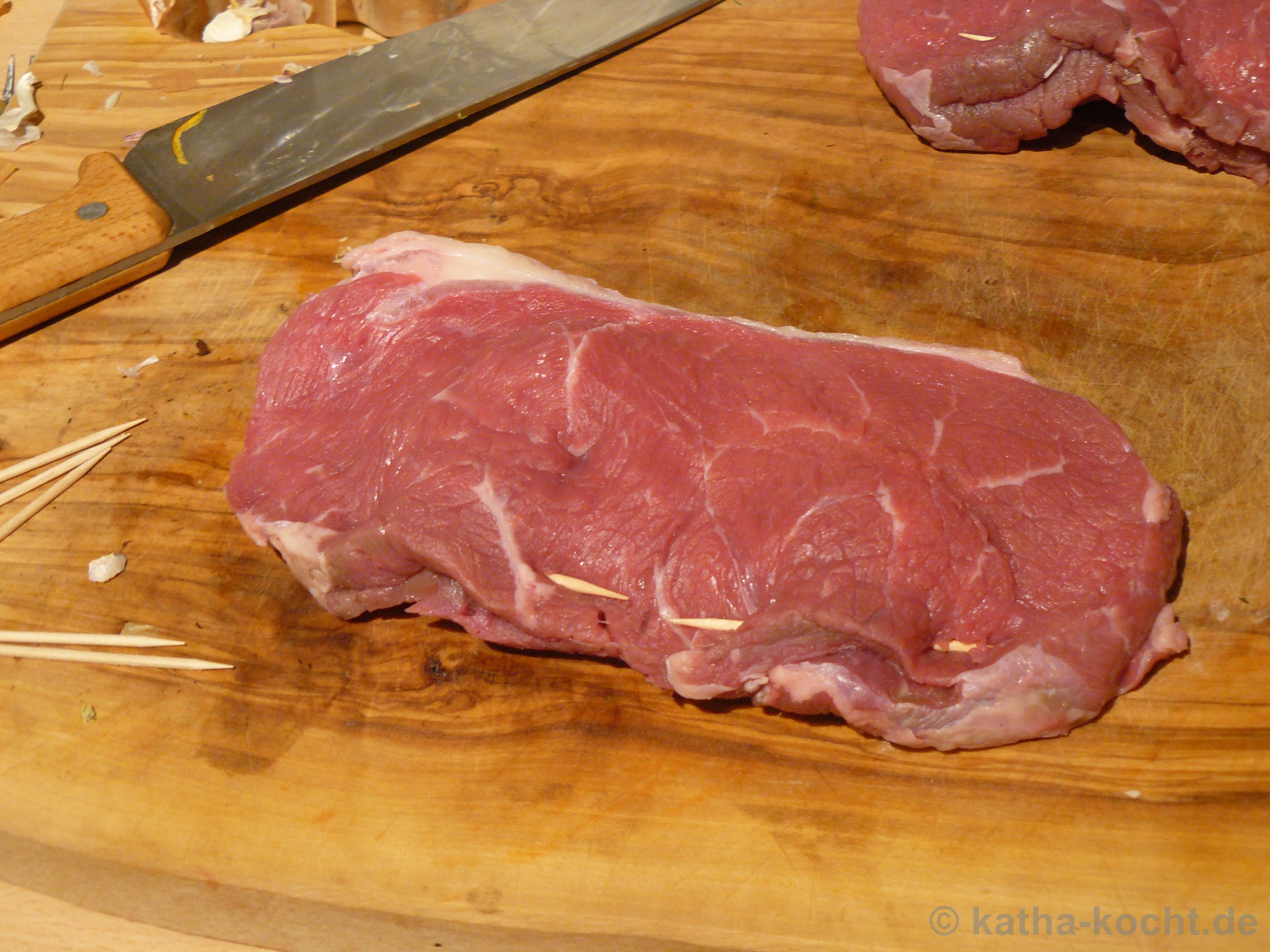 Widmen wir uns als nächstes dem Fleisch. Ich schneide in jedes Rumpsteak eine tiefe Tasche. Die wird dann mit je einer Scheibe Kochschinken und einer Scheibe Käse gefüllt und mit Holzspießchen verschlossen.