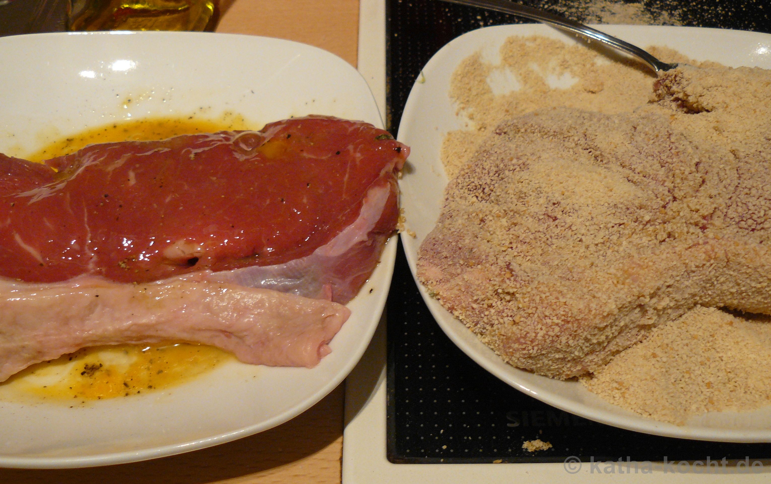 Für die Panade verquirle ich ein Ei mit Pfeffer und Salz in einem tiefen Teller. In einen zweiten Teller kommt das Paniermehl. Dann wende ich jedes Cordon-Bleu zuerst im Ei und lasse es dann rundum unter Paniermehl begraben kurz ruhen.