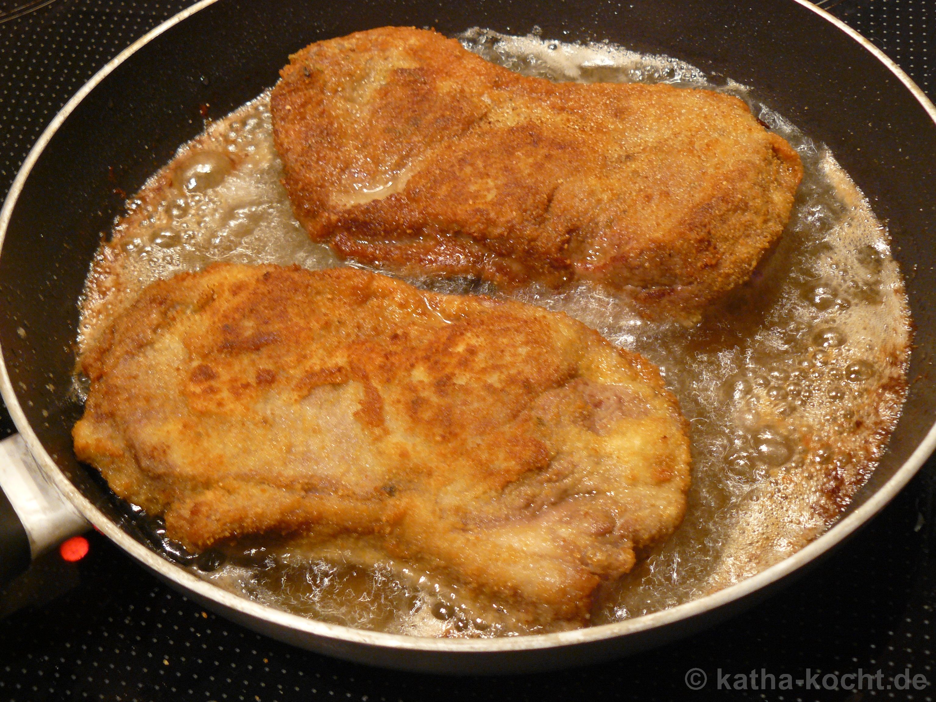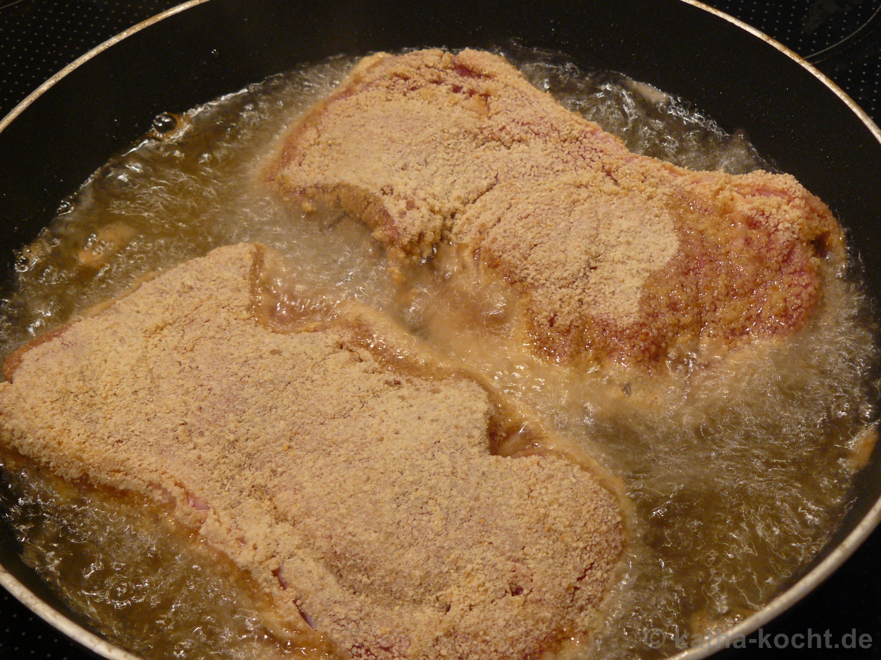 Wenn die Kartoffeln noch 20 Minuten brauchen geht es weiter. Ich erhitze das Schweineschmalz in einer ausreichend großen Pfanne. Die Cordon-Bleus sollten von jeder Seite bei mittlerer bis hoher Hitze (hier Stufe 6 von 9) 8 Minuten lang ausgebacken werden. Dann ist das Fleisch medium.