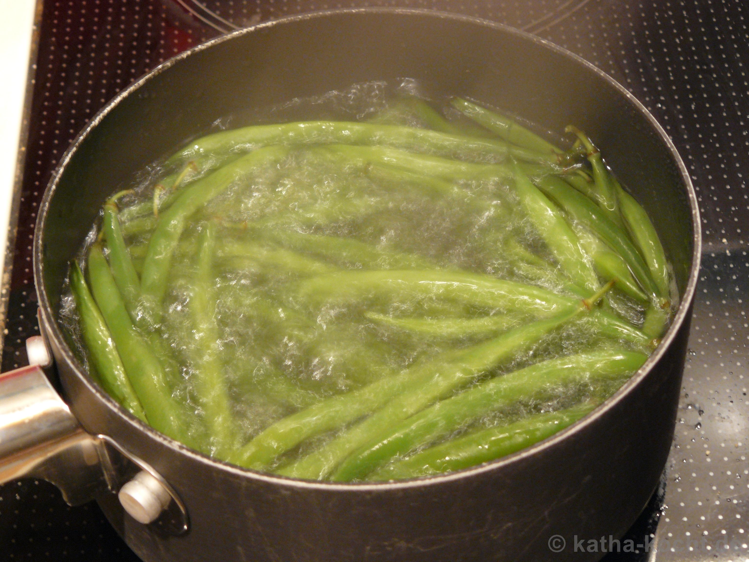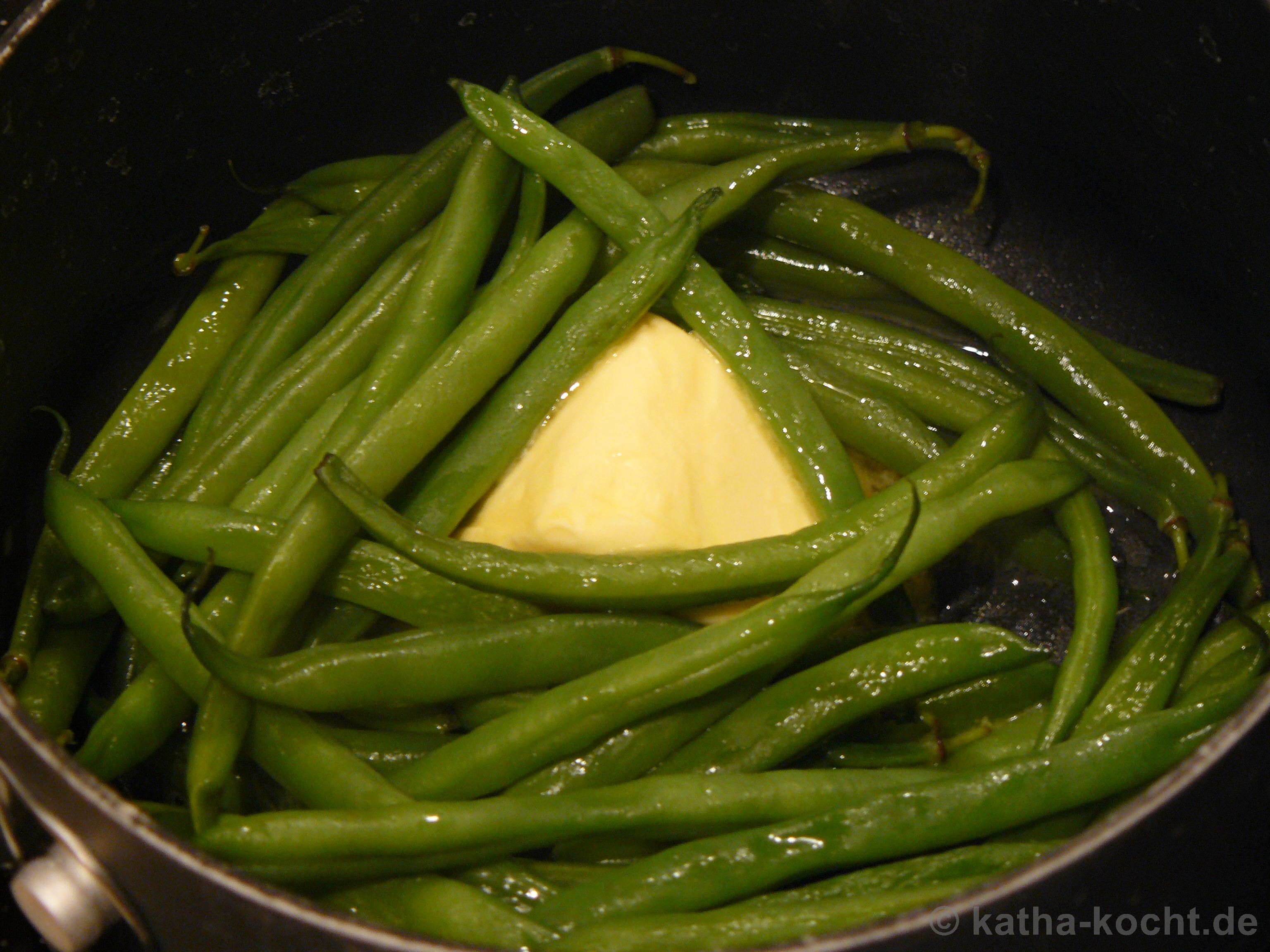Während die Cordon-Bleus ausbacken erhitze ich einen Topf Salzwasser und gebe gebe die grünen Bohnen für 8 Minuten in das kochende Wasser. Abgießen und mit einem Löffelchen Butter zurück in den Topf geben.