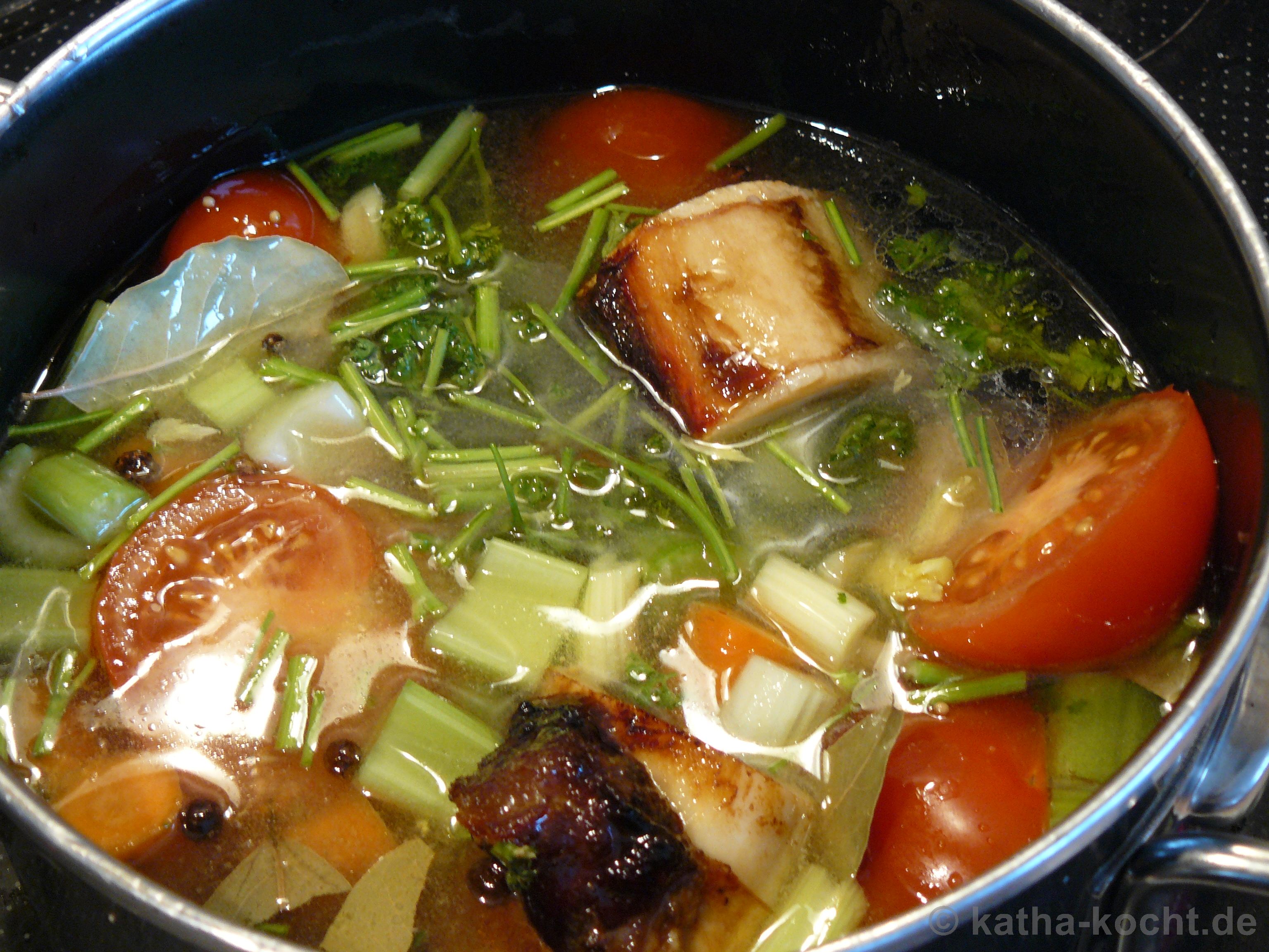 Als ich im Rahmen meines Weihnachtsmenüs die Klare Gemüsesuppe mit Kalbs-Pistazien Klößchen gekocht habe gab es keine halben Sachen. Also habe ich 2 Tage vorher nicht nur selbst gemachten Fisch Fond aus den Karpfenköpfen gekocht sondern auch Rinder Fond aus Suppenknochen. Mit den Zutaten habe ich etwas experimentiert – ich habe hier Tomaten mit in den Fond gegeben. Dadurch hat das Ganze eine wunderbar frische Note bekommen.