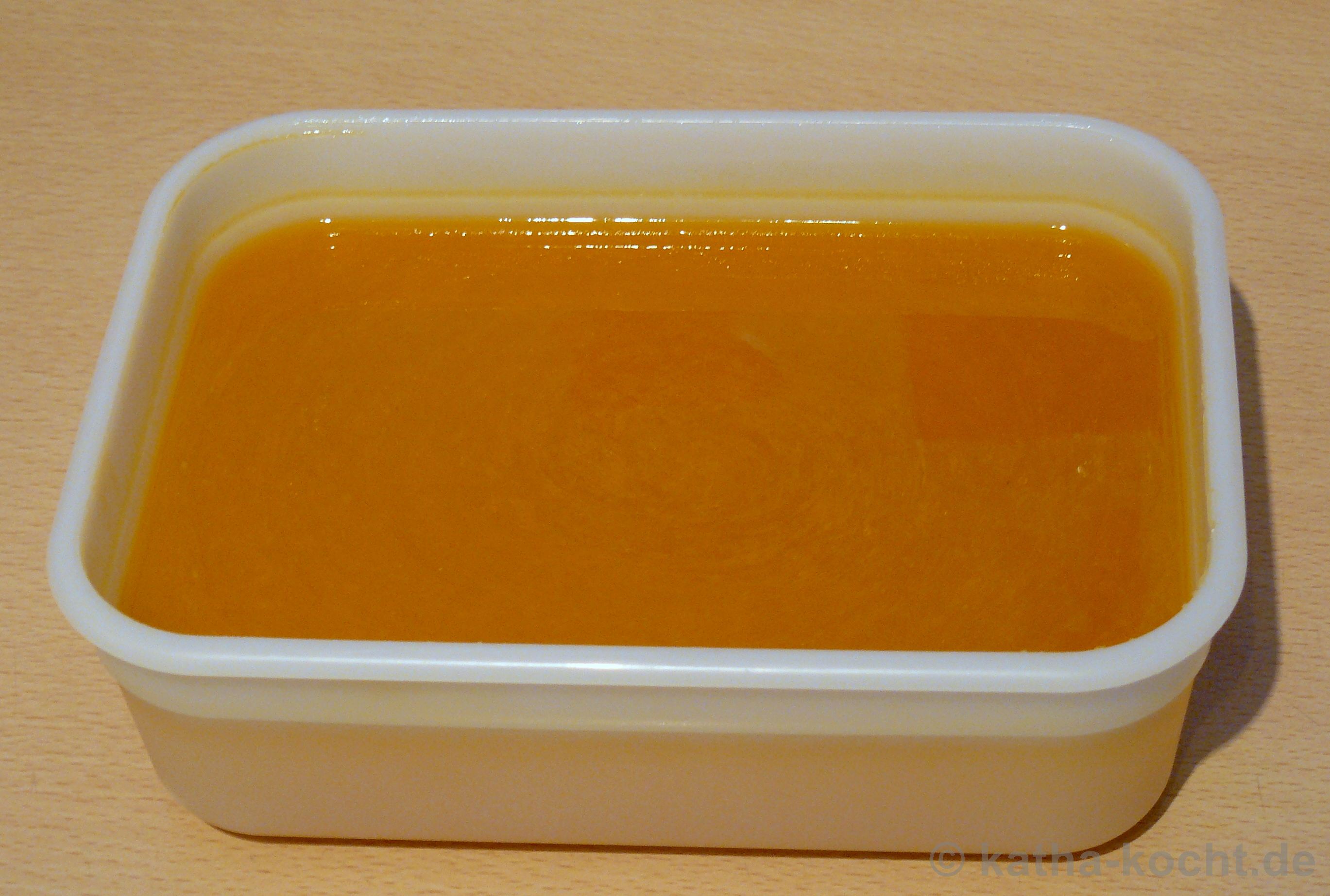 Am Ende habe ich alles durch ein großes Sieb in einen Messbecher abgegossen. Die Einlage kommt so wie sie ist weg. Den Fond habe ich mit etwas Balsamico Bianco abgeschmeckt. Man hat jetzt zwei Möglichkeiten was man mit dem Fett macht das sich doch recht reichlich gesammelt hat. Man kann es entweder vorsichtig abtrennen wenn man den Fond sofort verwenden oder einfrieren möchte. Man kann es aber auch im Fond lassen (das habe ich hier gemacht) und das Ganze abkühlen lassen und dann in den Kühlschrank stellen. So ist das Fett ausgehärtet und ich konnte es bevor ich den Fond eingesetzt habe wie ein Platte einfach abheben. Das war auf jeden Fall super einfach und ging ohne größeres Kleckern.