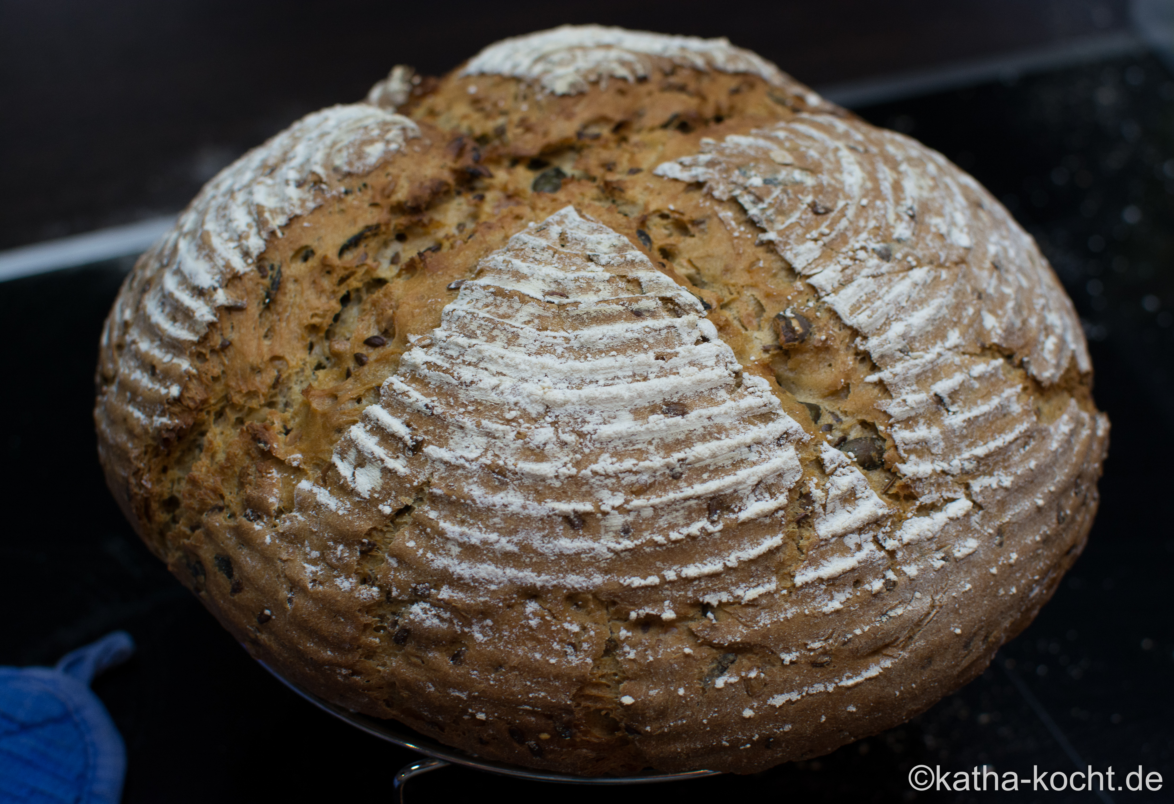 Nach 20 Minuten Dampf ablassen und die Temperatur auf 180°C reduzieren. Das Brot noch 35 Minuten fertig backen. Dann darf es auf einem Gitterrost auskühlen.