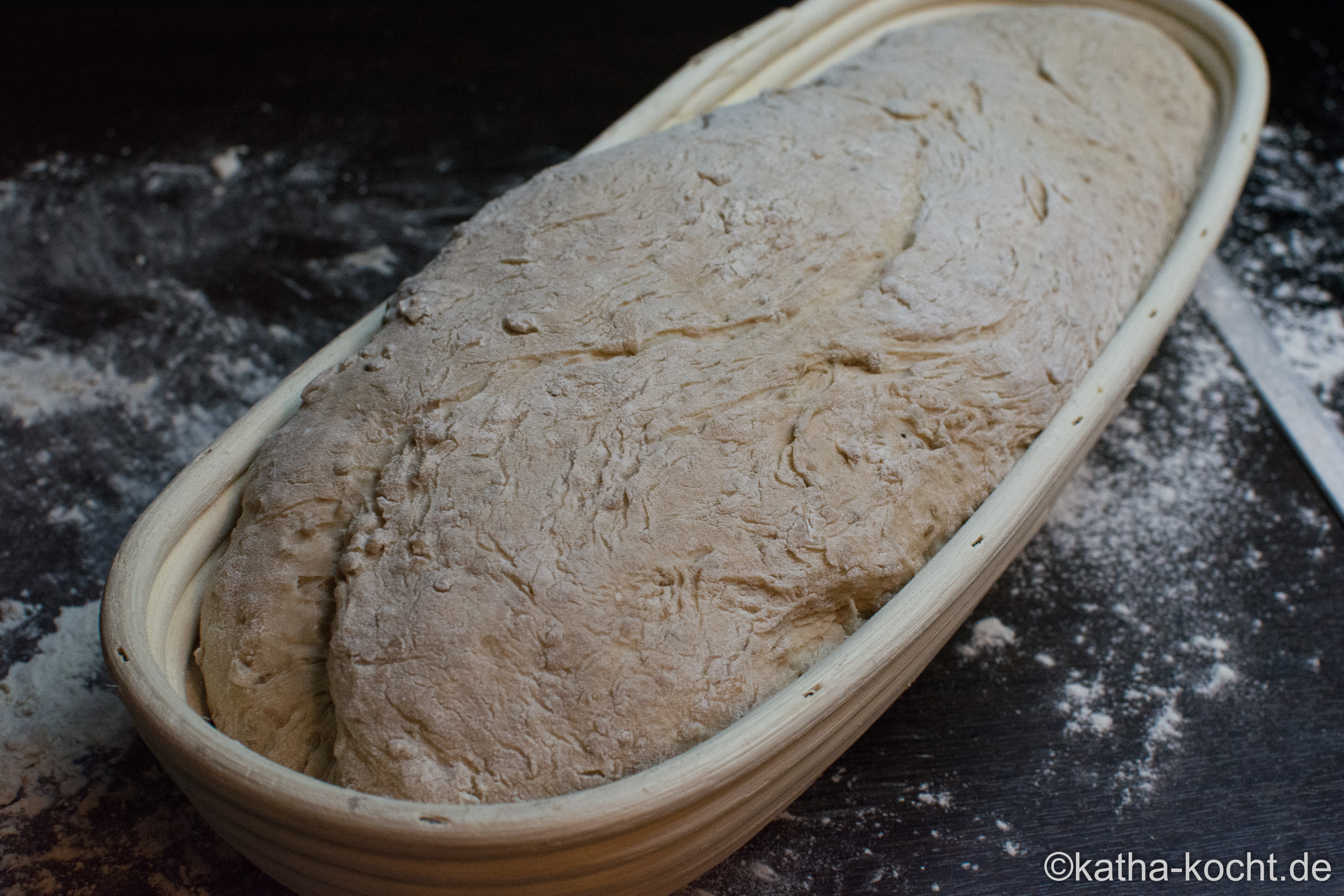 Alle Zutaten für das Brot in die Küchenmaschine geben und 10 Minuten verkneten bis ihr einen super klebrigen Teig habt. 2 Stunden gehen lassen und den Teig dann auf der bemehlten Arbeitsfläche einige Male falten bis er nicht mehr klebt und gut formbar ist. 3-4 mal längst falten und in ein passendes Gärkörbchen geben.