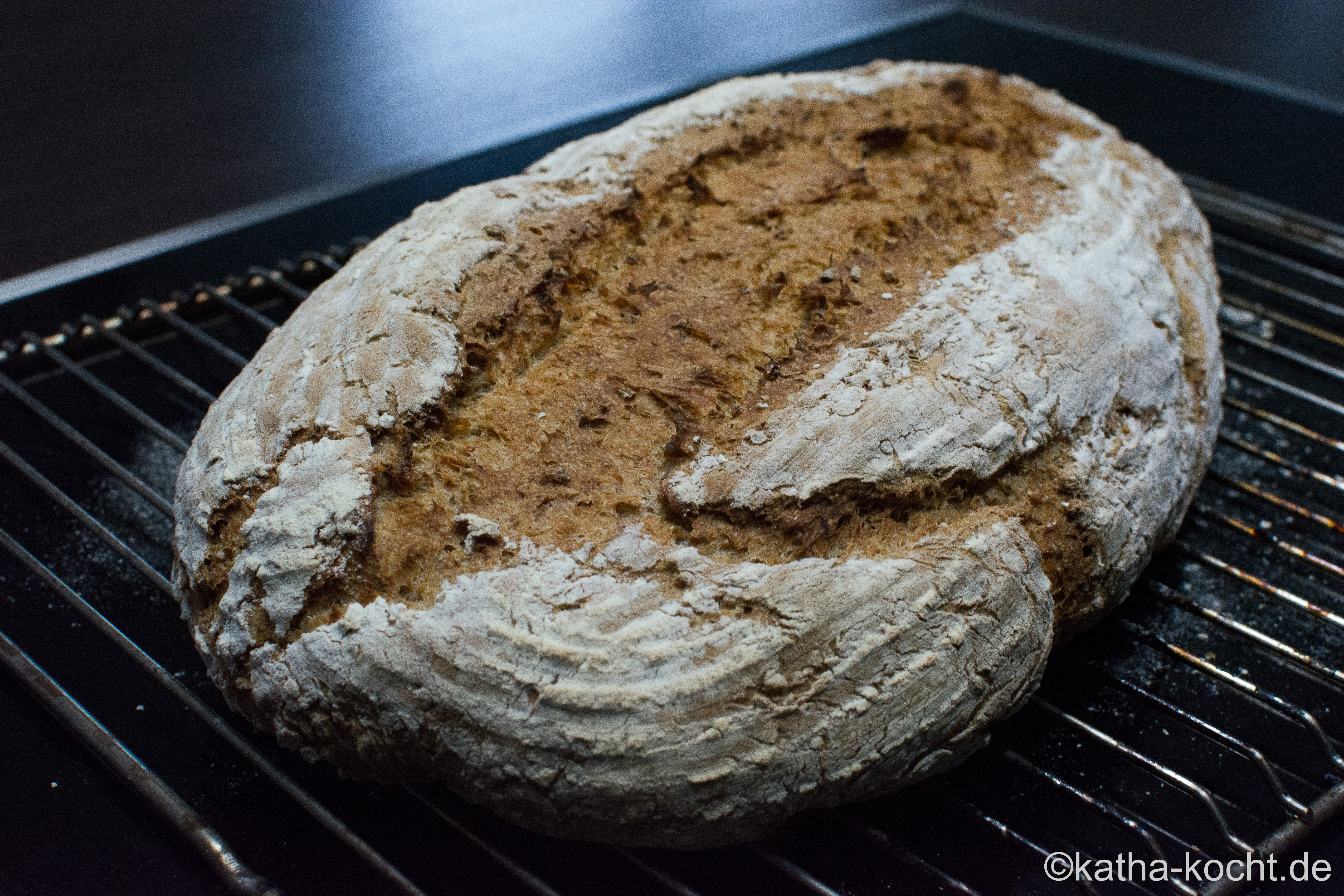 Den Teig im Gärkörbchen nochmal eine Stunde gehen lassen und dann bei 230°C mit Schwaden in den vorgeheizten Backofen schieben. Bei mir im Brotbackmodus, alternativ mit einem Backblech mit Wasser unten im Backofen.