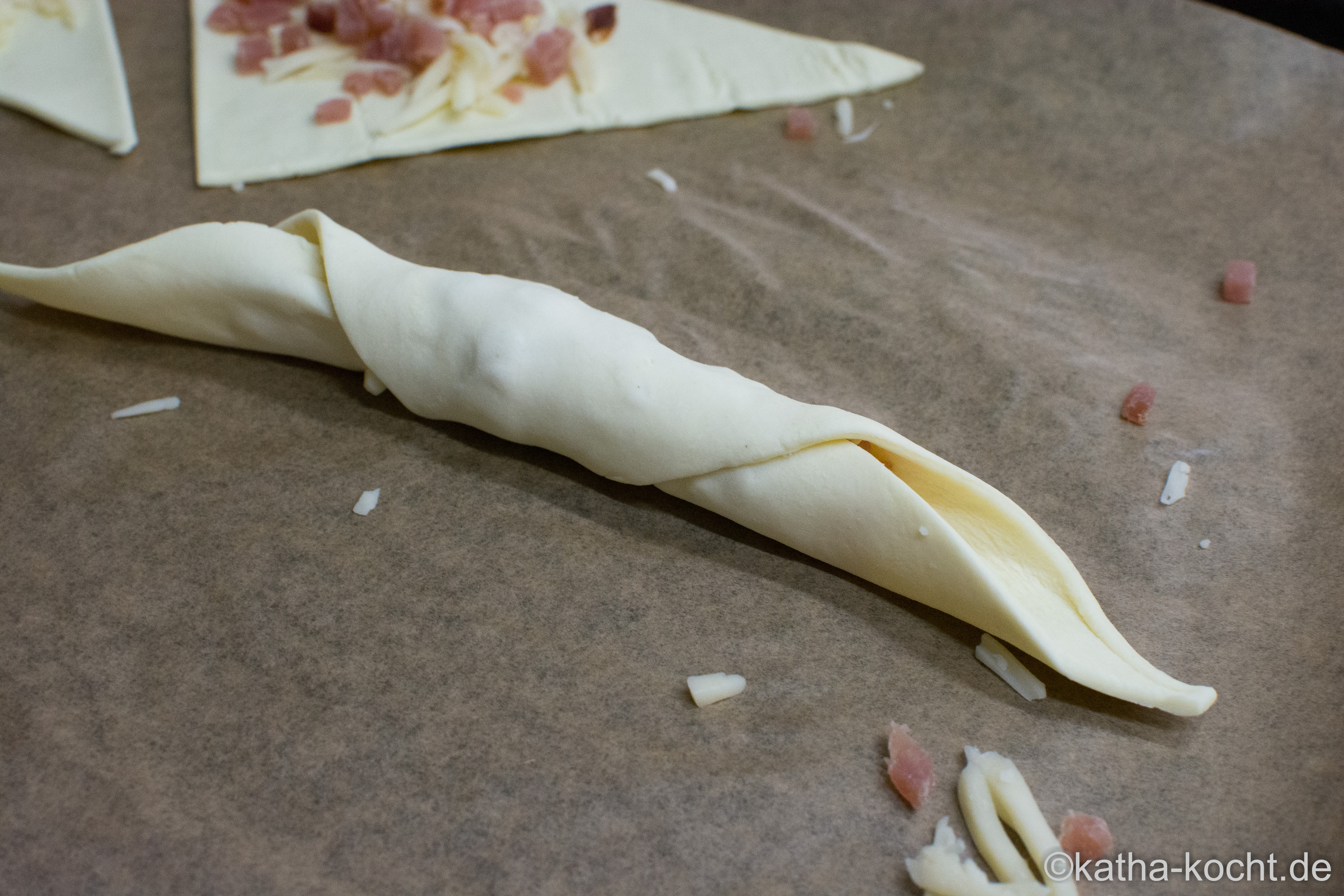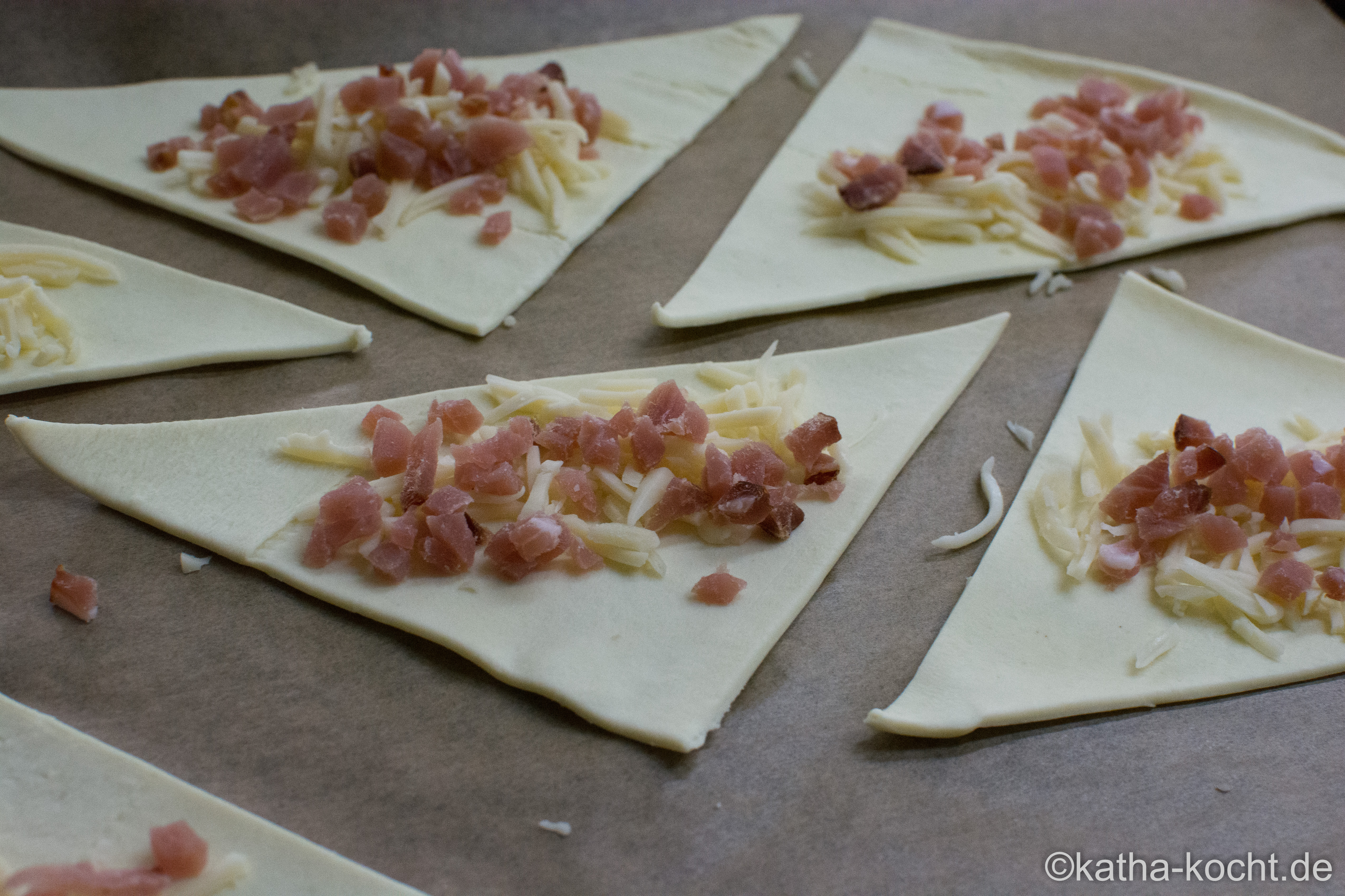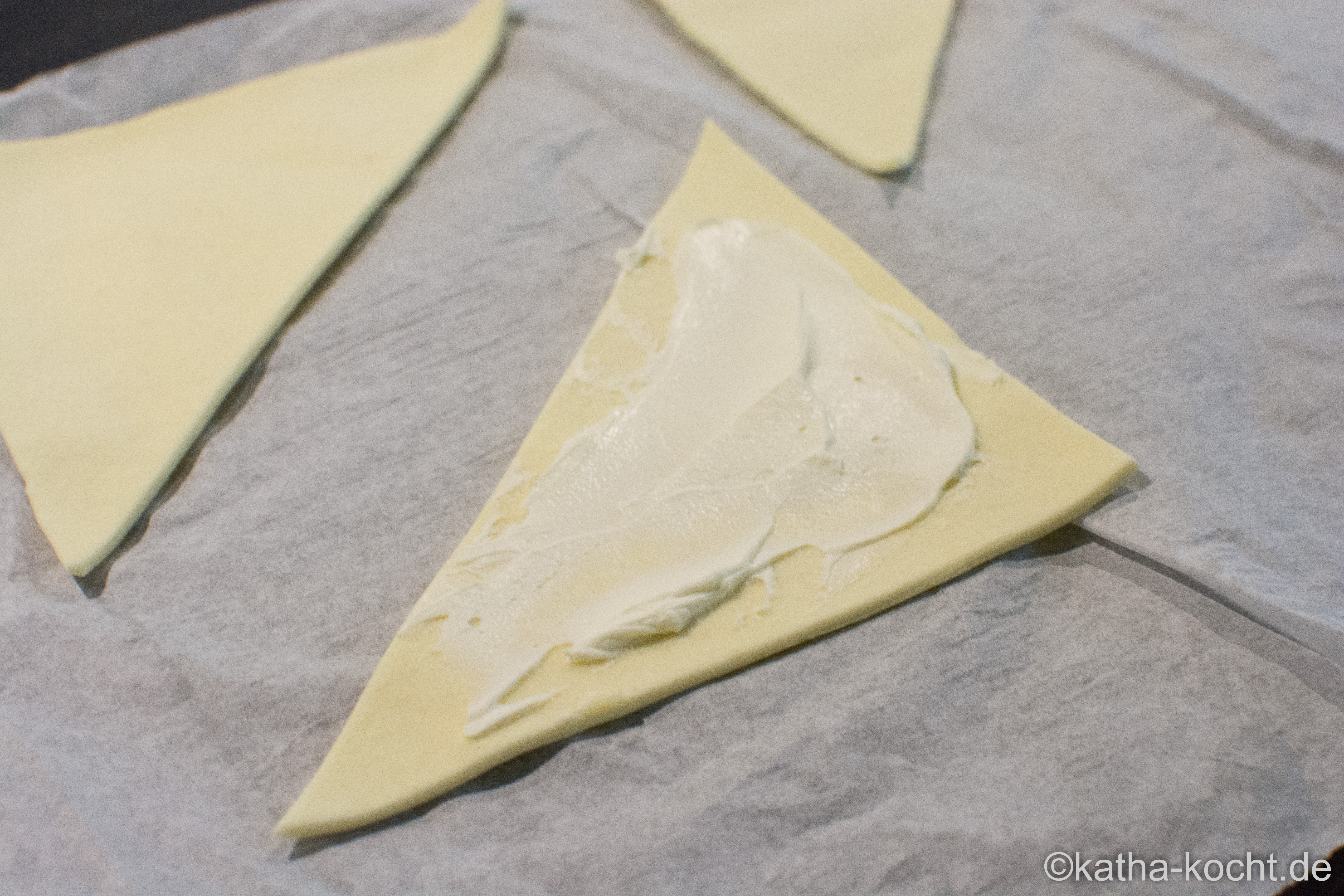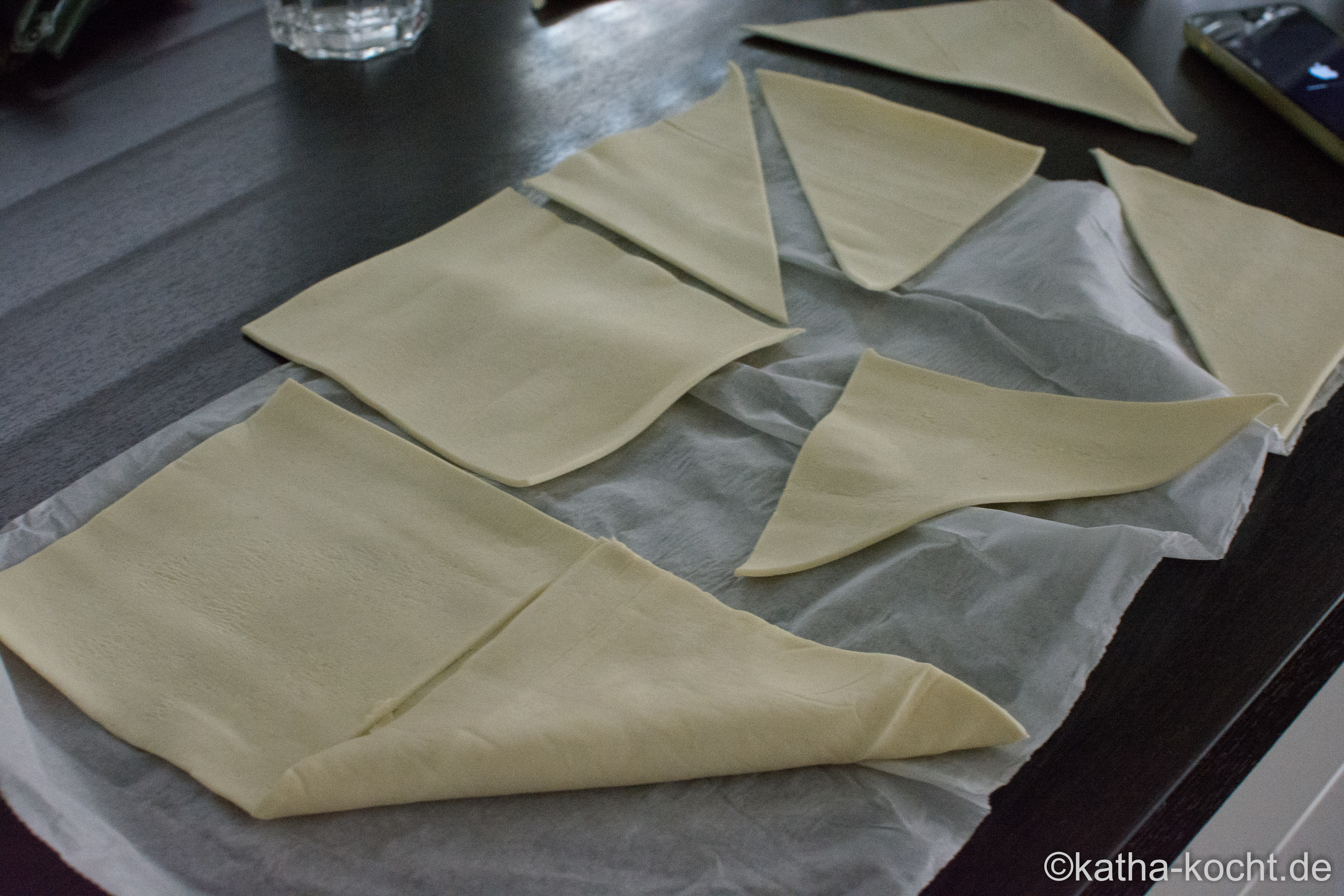 Den Blätterteig ausrollen und in 6 ungefähr gleichgroße Quadrate schneiden. Jedes Quadrat nochmal diagonal durchschneiden. Dann habt ihr 12 Dreiecke.