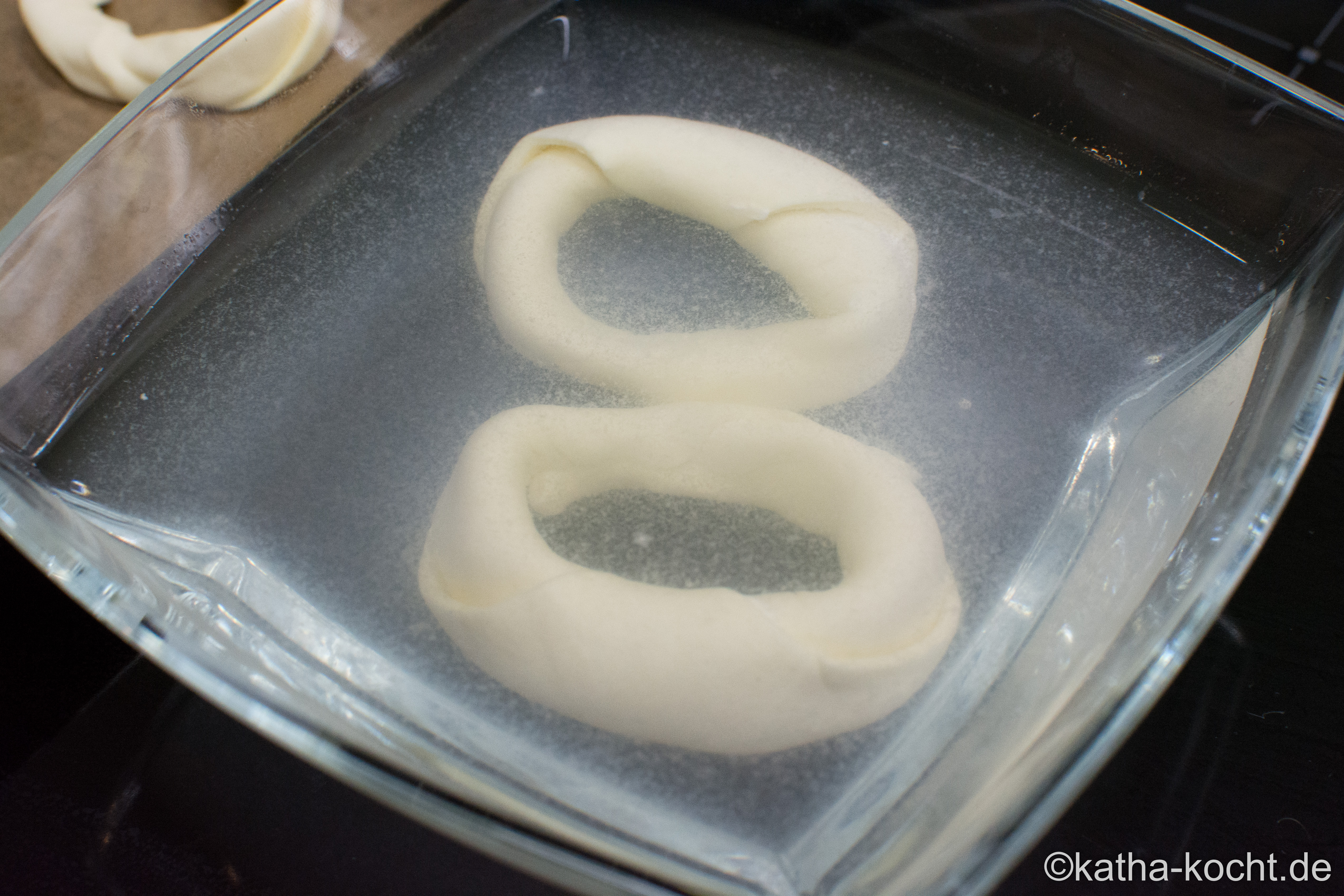 Das Natriumhydroxid in einer Glasschale in kaltem Wasser lösen. Dazu mit einem kleinen Löffel rühren, aber Vorsicht – nicht kleckern oder spritzen, das ist weder für euch noch für eure Küche gut. Die Teigkringel mit der Schaumkelle in die Lauge geben und für 5-6 Sekunden darin abtauchen lassen.