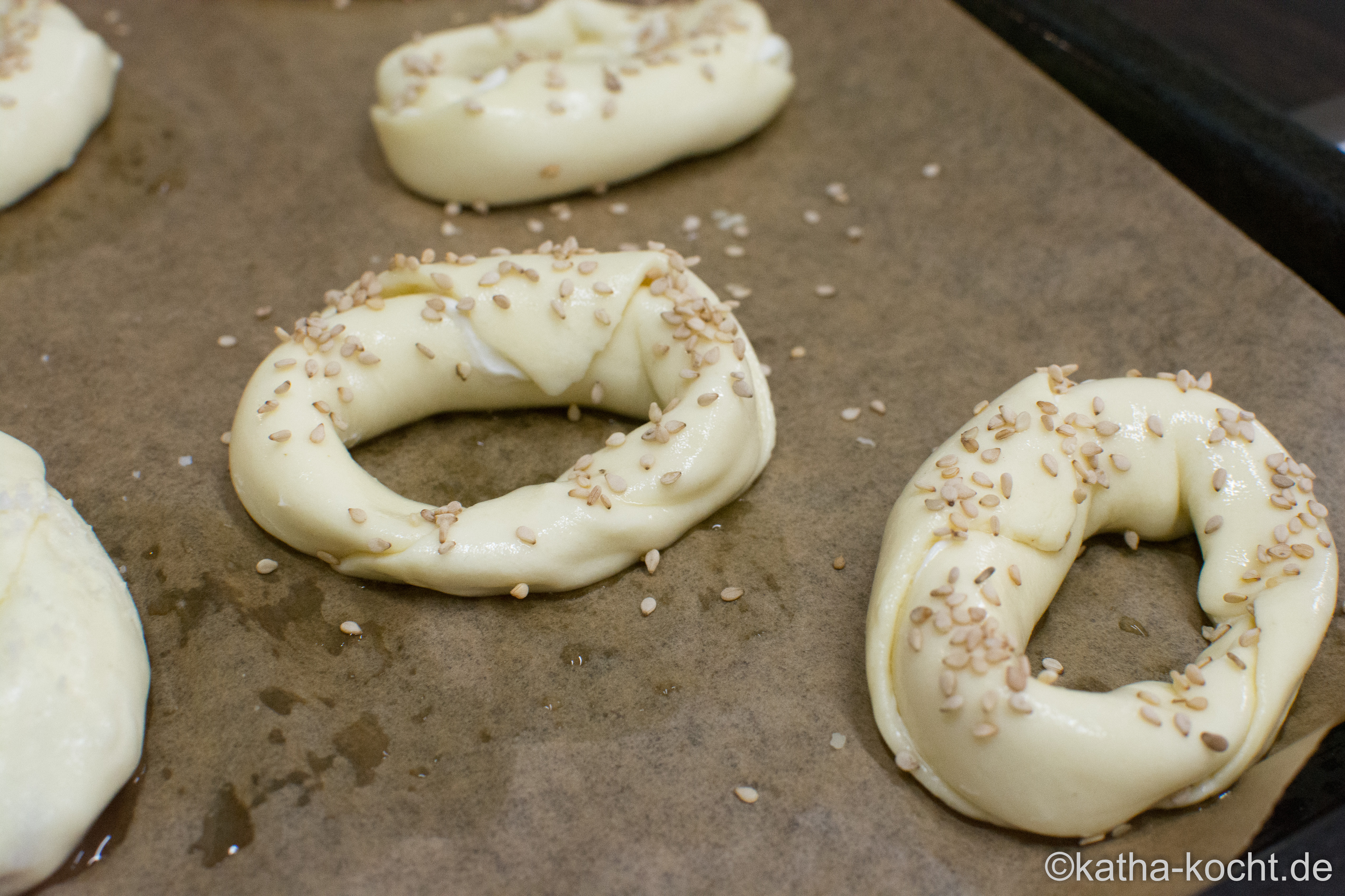 Auf ein mit Backpapier ausgelegtes Backblech legen und mit Sesam…