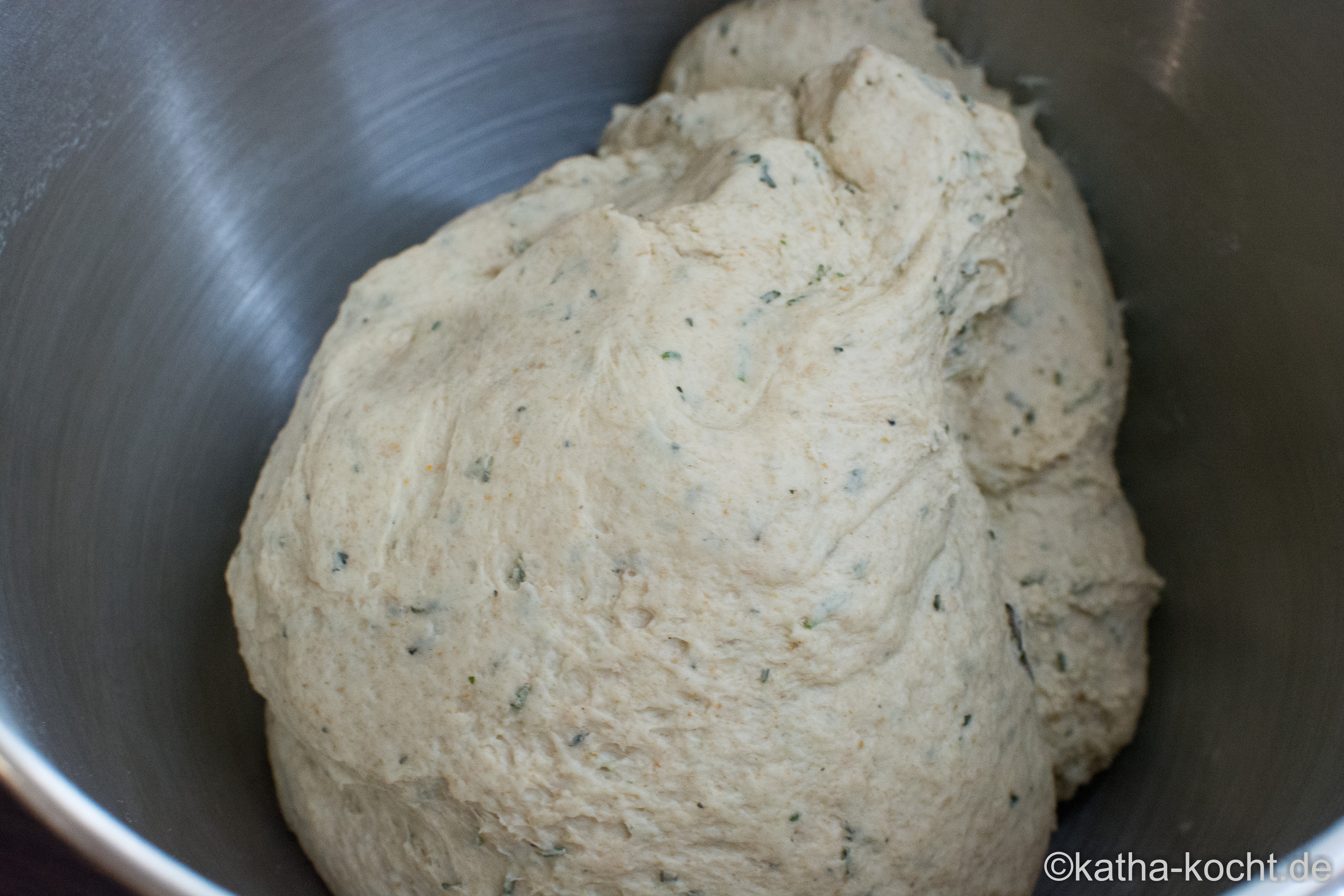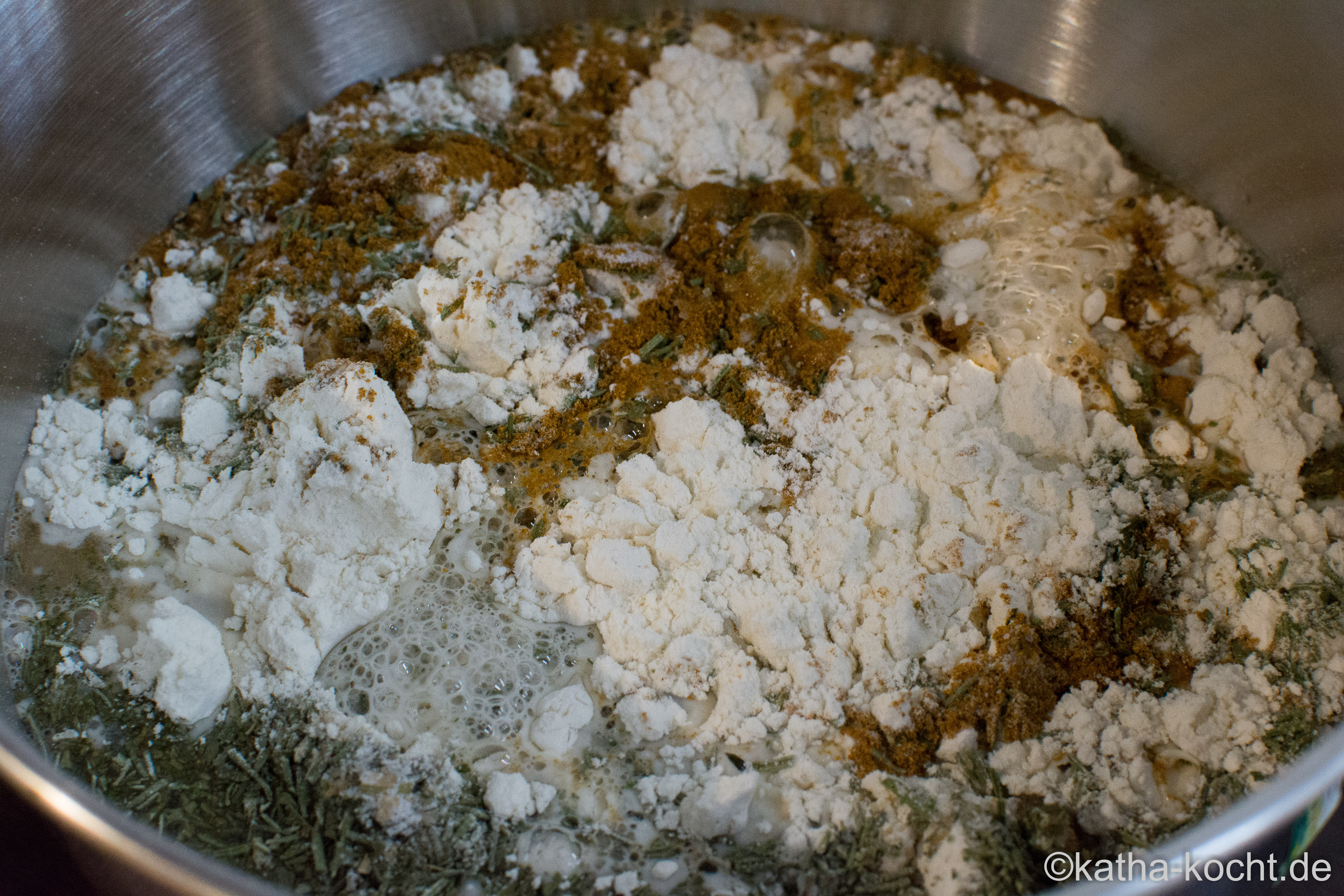 Nicht schnell, aber einfach. Ich mische das Mehl, den zerbröselten Hefewürfel, die getrockneten Kräuter, Salz und Zucker in einer großen Schüssel. Dann gebe ich das Wasser dazu…