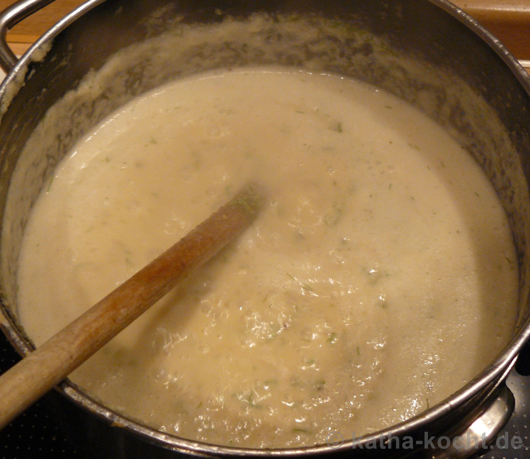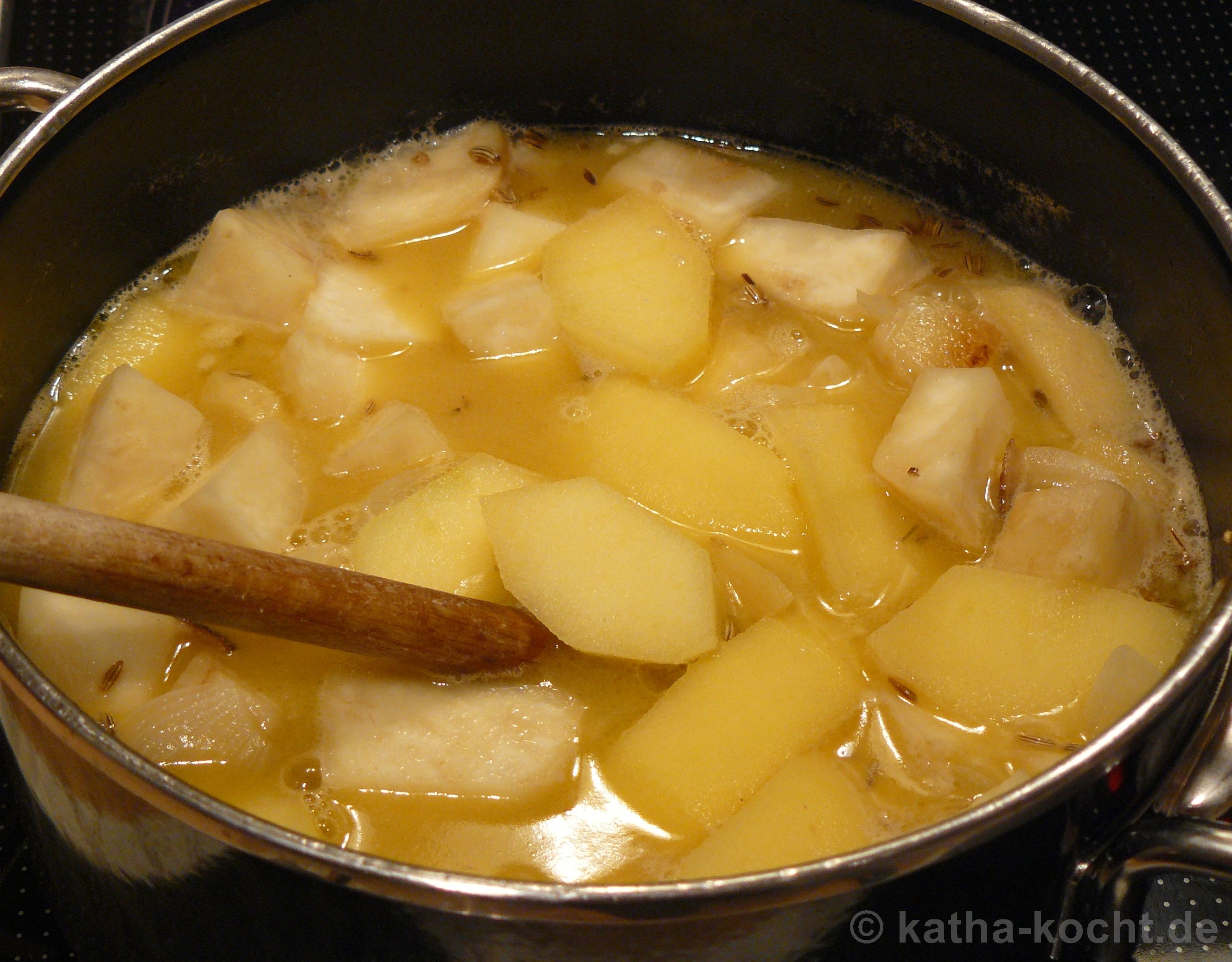 Der Knollensellerie, die Zwiebel und die Äpfel werden geschält, die Äpfel entkernt und alles grob gewürfelt. Die Würfel gebe ich mit der Brühe in einen ausreichend großen Topf. Den Fenchel dazu geben, einmal kurz sprudelnd aufkochen und dann alles für 20 Minuten bei mittlerer Hitze (hier Stufe 5 von 9) köcheln lassen.