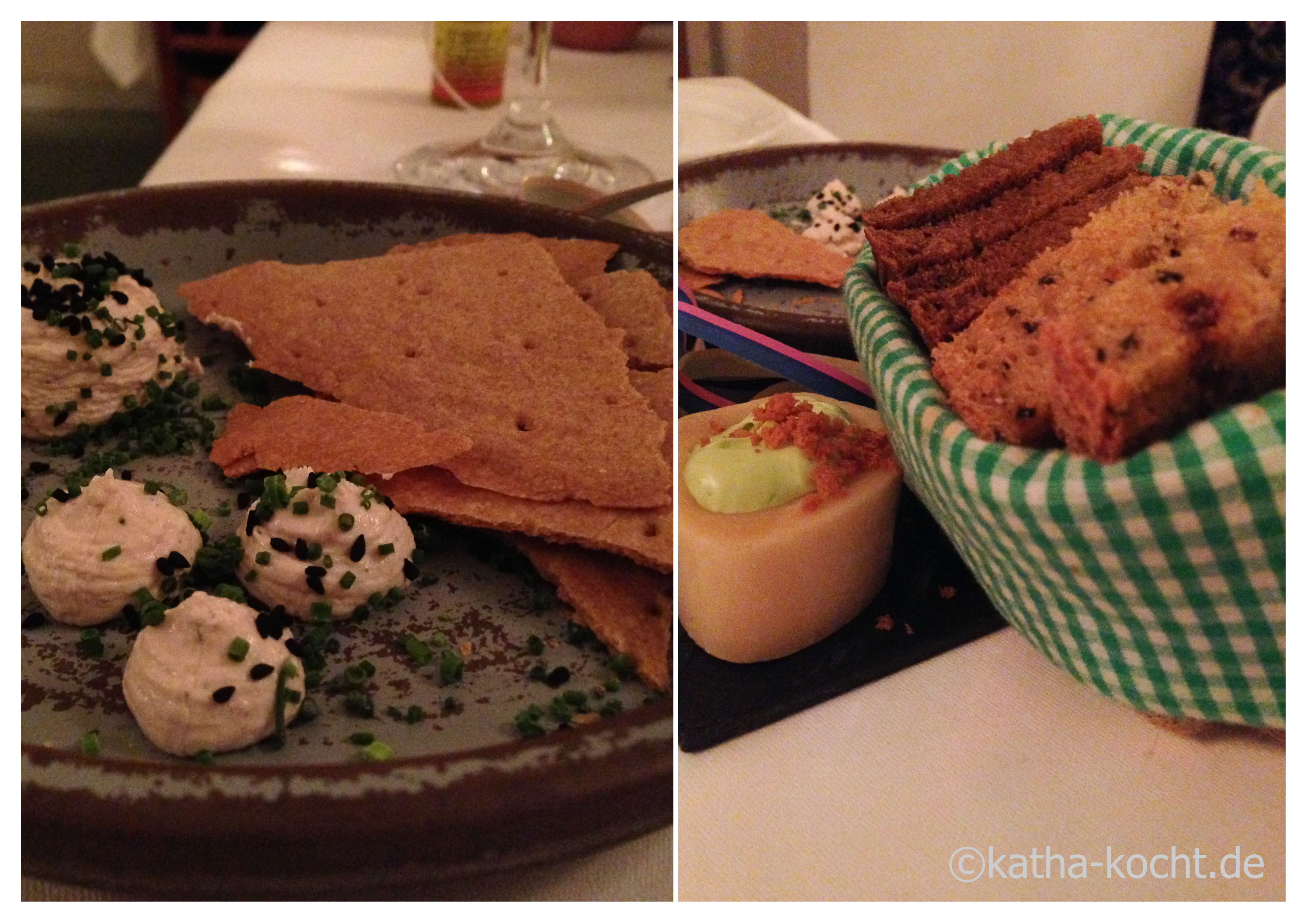 Ähnlich wie zum Menü im Juli gab es Creme und Knäckebrot, gefolgt von Malzbrot, Ciabatta und Kräuterbutter im Rinderknochen. Wir stoßen mit einem Gläschen „Platine“ Champagner auf den Abend an.
