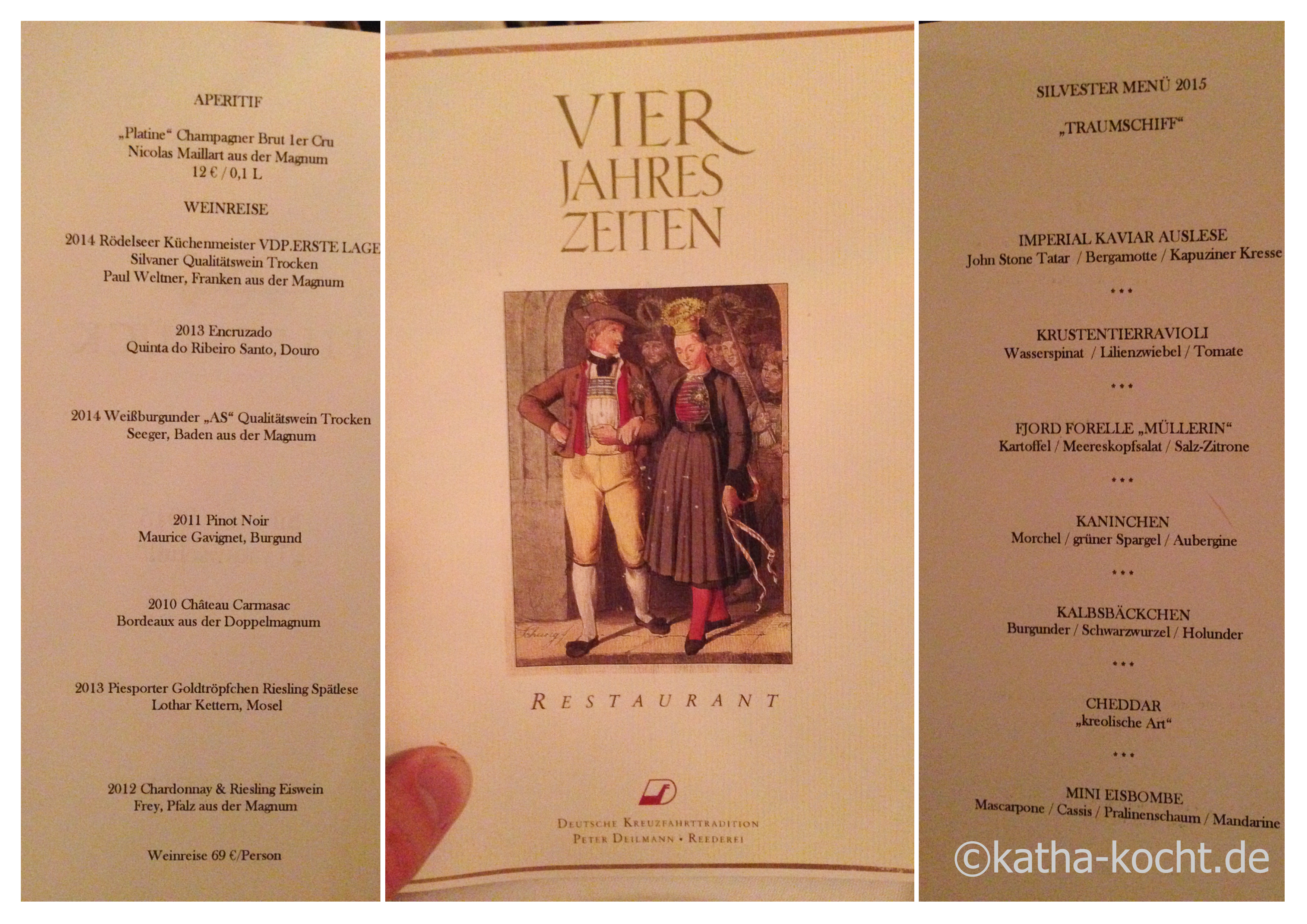 Je näher das neue Jahr kam, desto mehr Infos gab es – ein paar Weine wurden auf Facebook verraten und die „Crew“ mit waschechten Traumschiff Uniformen eingekleidet. Und das Warten hat sich gelohnt, als wir um 19Uhr das Restaurant betreten haben waren die Tische mit Knallbonbons, Glitzerkonfetti und Luftschlangen eingedeckt und das Menü (ganz im Traumschiffstil) klang ganz bezaubernd.