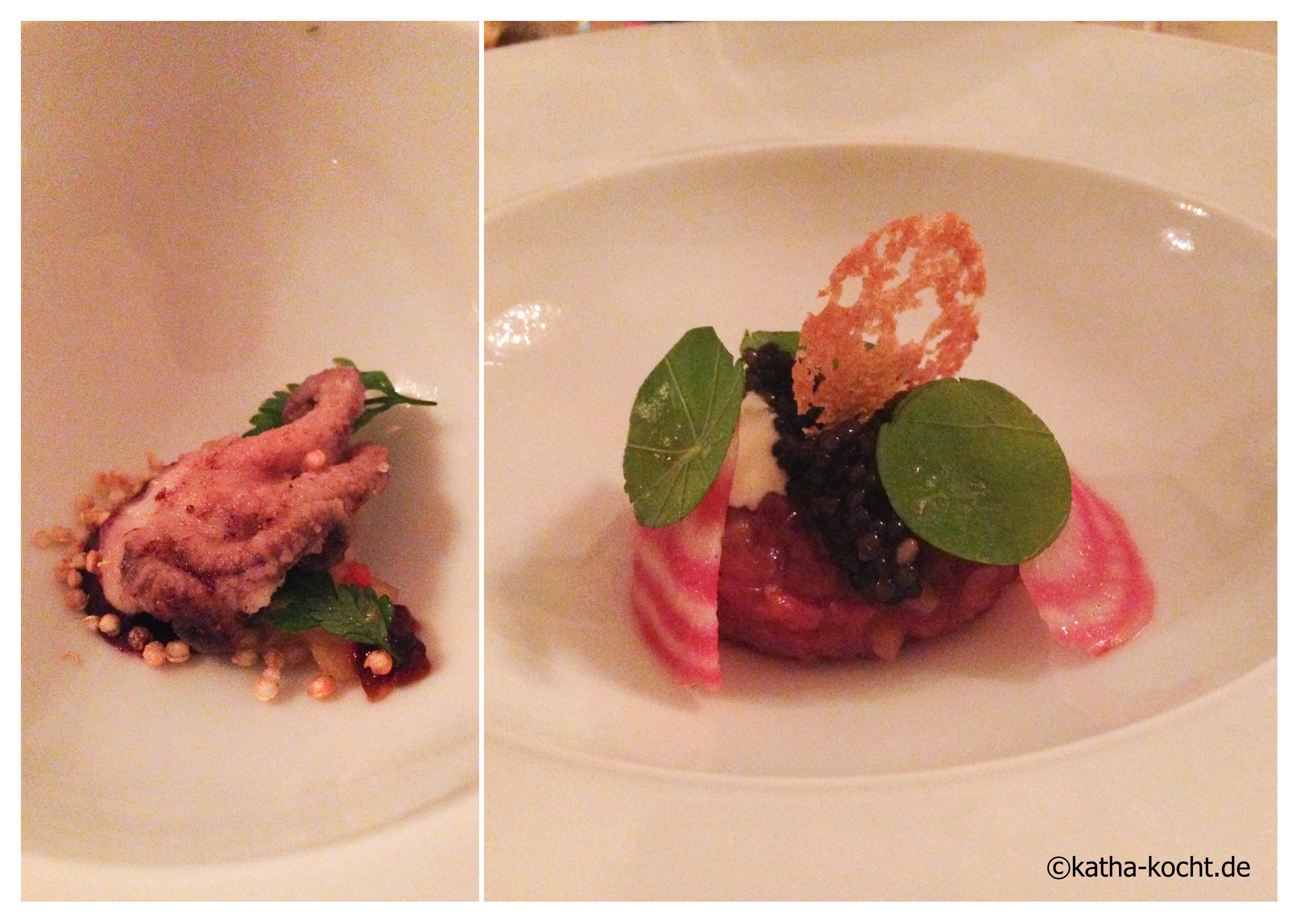 Als Amuse Bouche bekommen wir einen kleinen Polpo auf fruchtig scharfer Salsa. Dann folgt der erste Gang – feines Tartar mit einer Imperial Kaviarnocke. Dazu gibt es einen Silvaner vom fränkischen Weingut Paul Weltner der Bessere Hälfte besonders gut gefallen hat.