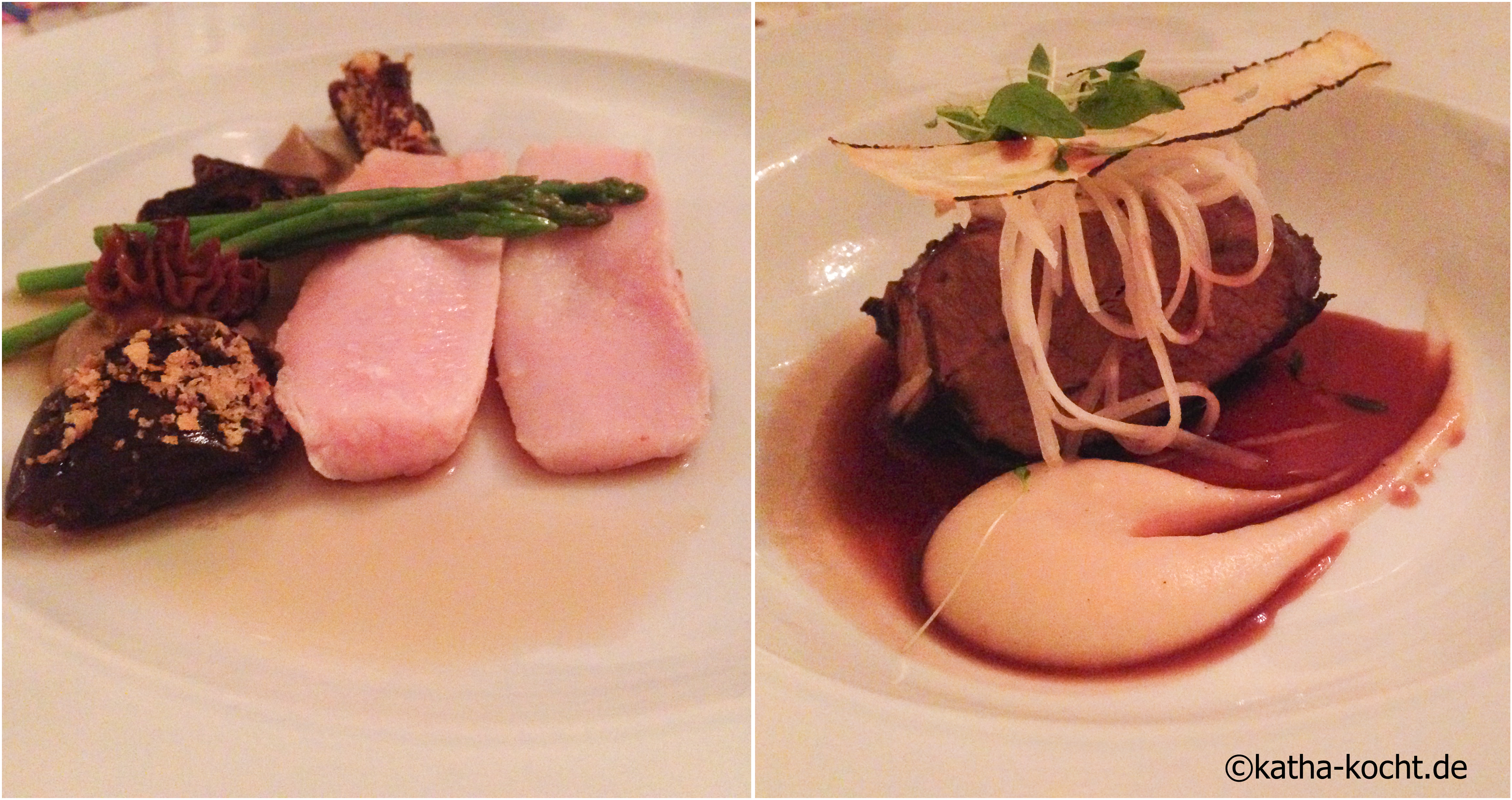 Mit dem nächsten Gang begeben wir uns in die klassische Region – Kaninchenrücken mit Morchel und grünem Spargel. Da fragt man sich doch glatt was die Aubergine da macht? Aber auch hier sind wir vom schnöden Klassiker weit entfernt – da Kaninchen ist super zart rosa und mit Auberginencreme und eingelegter Aubergine alles andere als langweilig. Dazu ein Gläschen 2011er Pinot Noir – Herz was willst du mehr? Das Herz will vielleicht gar nicht so viel mehr, aber der Gaumen ist auf den Geschmack gekommen – und als im nächsten Gang das unglaublich gute, zarte und in der Mitte noch leicht rosa gegarte Kalbsbäckchen mit dem aufwendig vorbereiteten Schwarzwurzelchip kommt bin ich mir mit Küchenchef Sascha Ludwig einig, Bäckchen gehen einfach immer! Dazu ein 2010er Bordeaux aus der Doppelmagnum – das wäre für uns nicht die passende Flaschengröße für einen gemütlichen Abende zu zweit, aber wir sind definitiv begeistert. Die Witze aus den Knallbonbons werden übrigens auch immer lustiger, das könnte aber möglicherweise am Wein gelegen haben…
