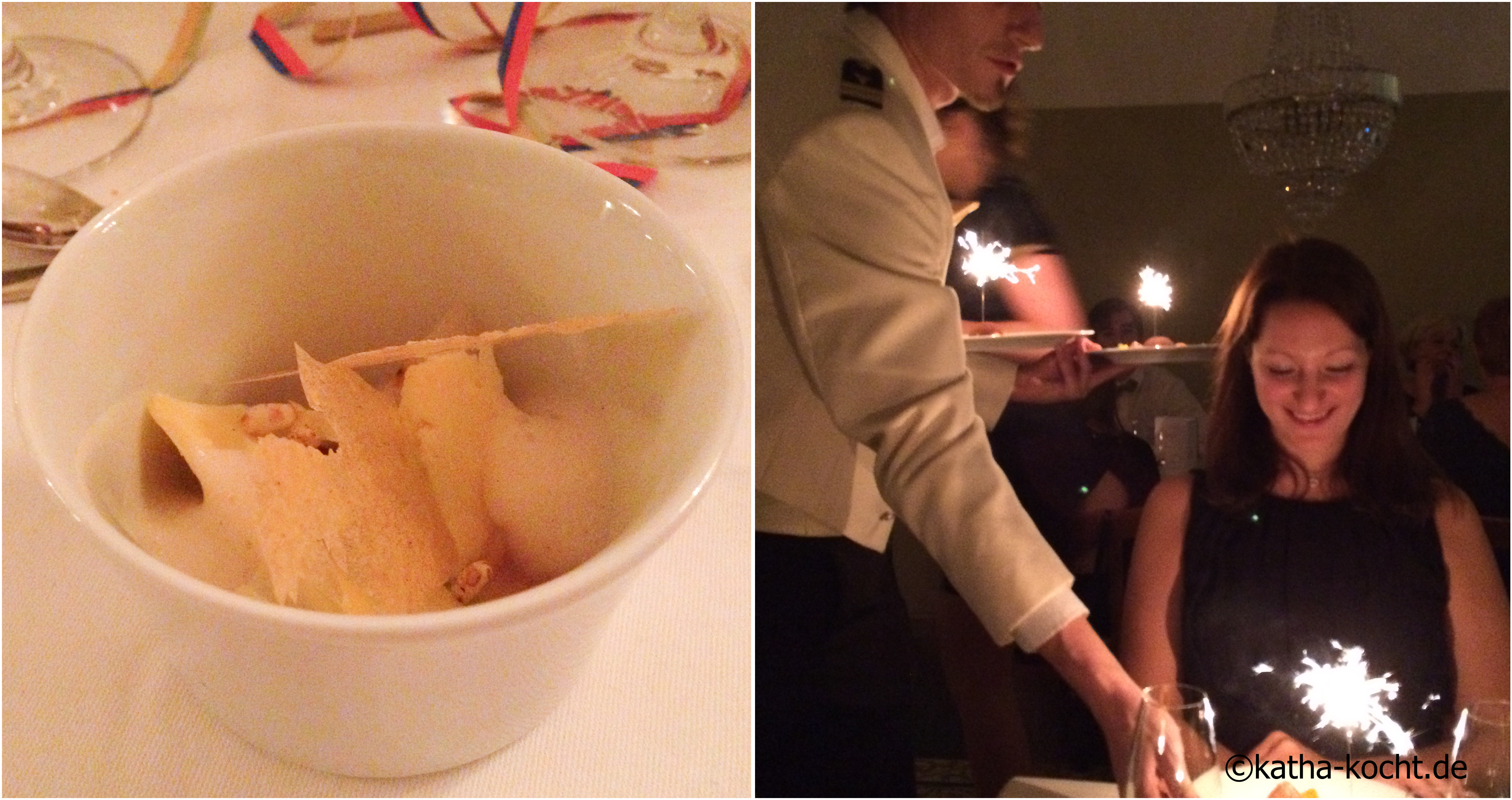 Könnt ihr es glauben – den ganzen Abend hat mein Handy mich gemobbt weil der Fotospeicher voll war. Also habe ich kurzerhand ein paar Apps gelöscht, aber ausgerechnet die Eisbombe – das klassische Traumschiff-Dessert – hat es scheinbar nicht aufgenommen. Gut, dass Bessere Hälfte ein paar Fotos gemacht hat als es serviert wurde. Im typischen Traumschiff-Stil mit gedämmtem Licht, passender Musik und natürlich Wunderkerzen. Hier sieht man, dass nicht nur in das Menü und die Weine, sondern auch in das Gesamtkonzept viel Liebe bei der Planung gesteckt wurde. Wir hatten auf jeden Fall unseren Spaß! Dazu gab es übrigens einen Chardonnay & Riesling Eiswein vom Weingut Frey aus der Pfalz, den ich ziemlich interessant fand.