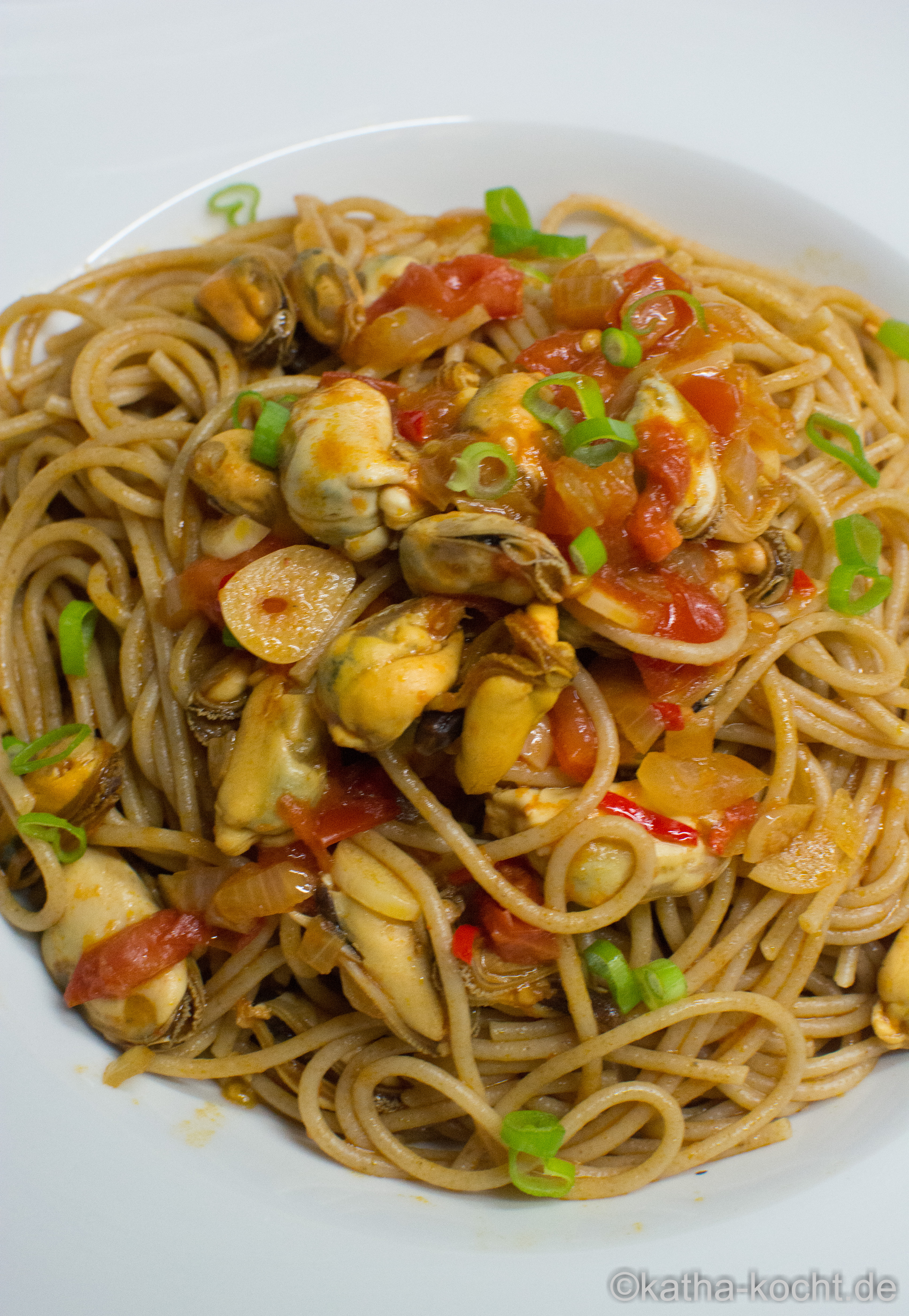 Ich habe Schalotten, Knobi und die Chilischote in Olivenöl angeschwitzt, zwei Zweige Thymian dazu, Tomatenmark und dann mit Weisswein abgelöscht. Dann habe ich die aufgetauten Muscheln hinzugefügt und es etwas einkochen lassen. Die Zitrone habe ich durch den Weisswein weglassen können. Frühlingszwiebeln und geviertelte Cherrytomaten dazu und kurz vor dem Anrichten noch eine Hand voll frischen Basilikum, Thaibasilikum (!!! ganz grandios), Oregano, italienische Petersilie und die restlichen Frühlingszwiebeln. Mein Mann wollte mich heute glatt noch einmal heiraten.