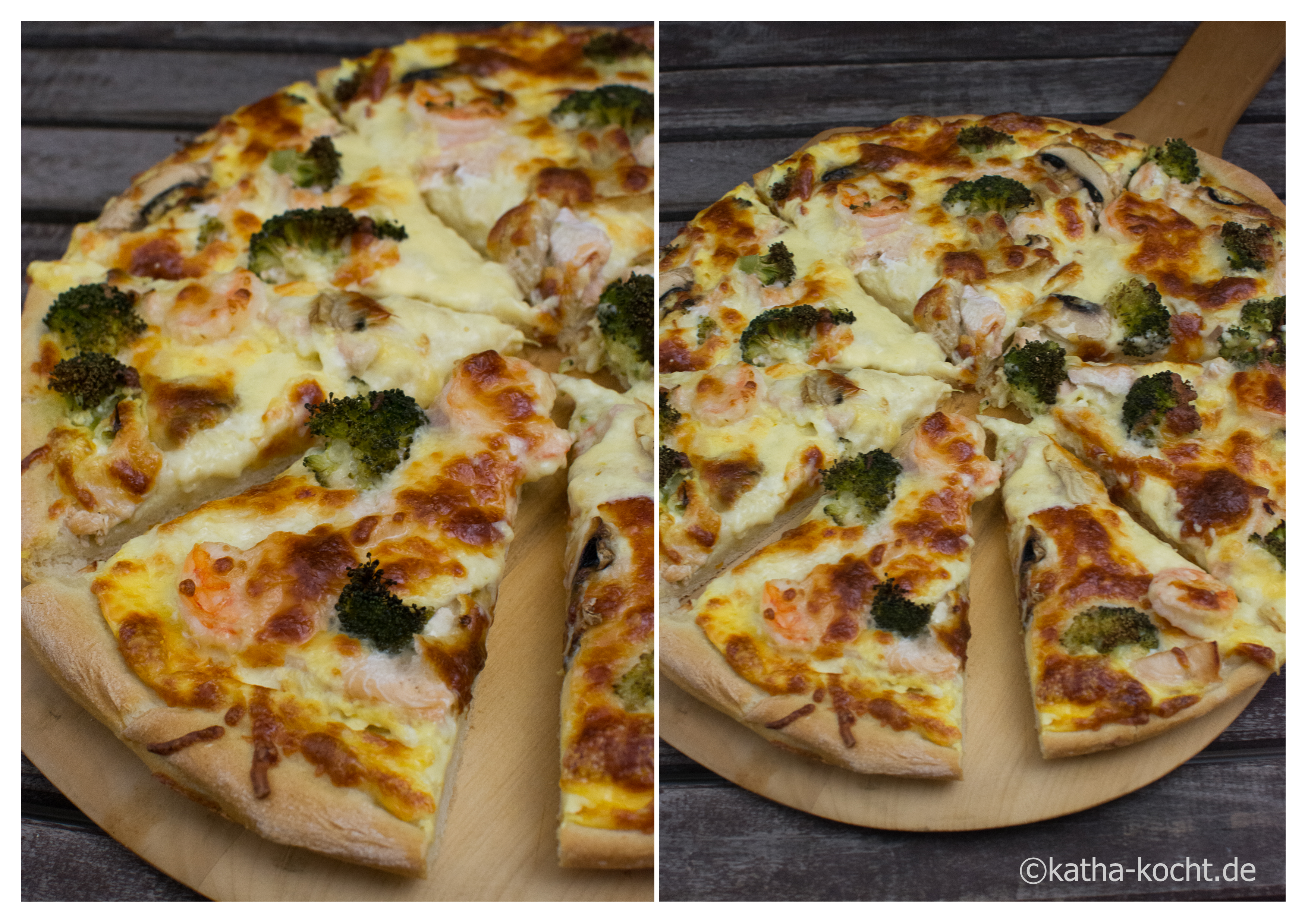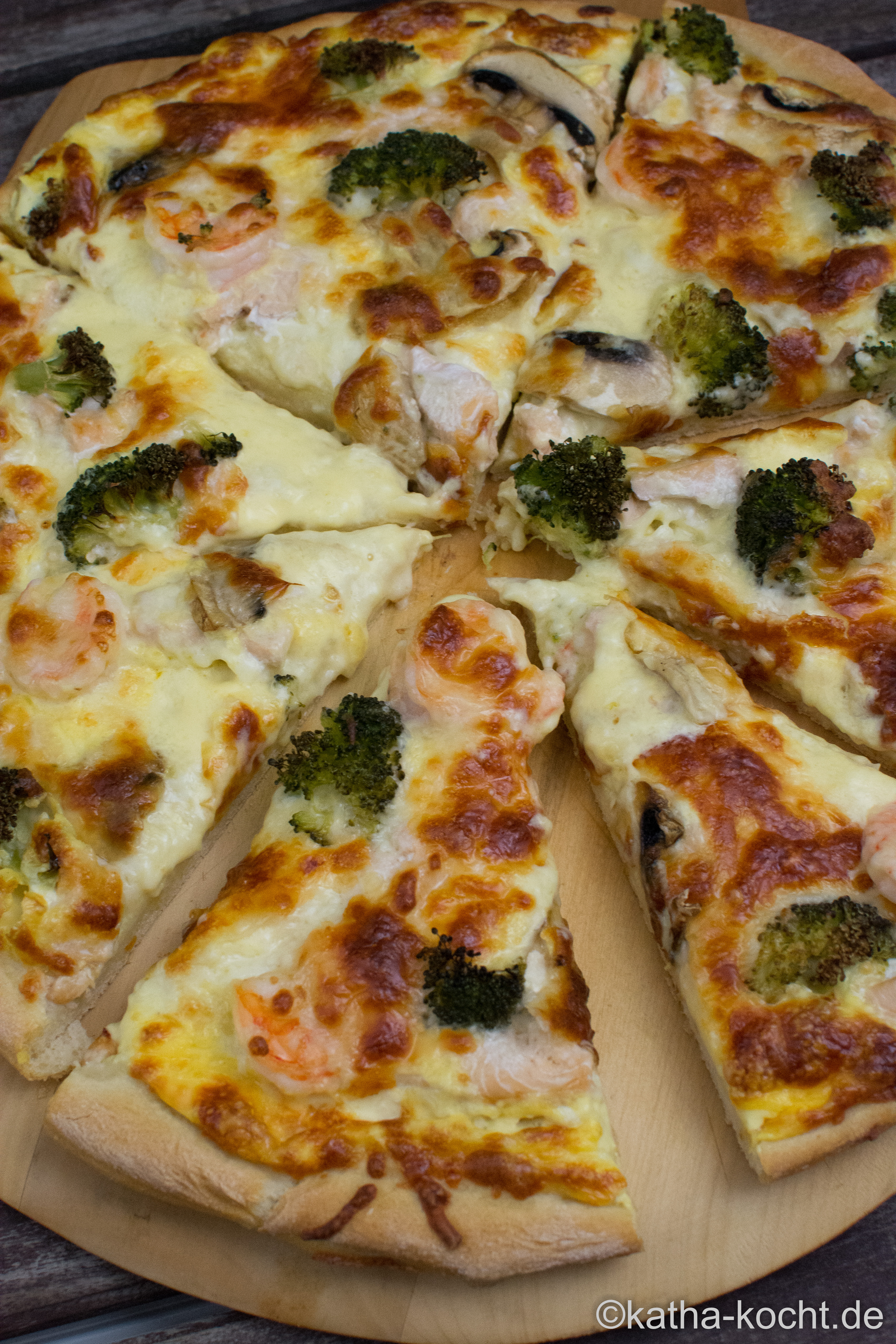 Bei mir eine typische Variante der „Mädels-Abend-Pizza“. Das ist unter anderem dem Umstand geschuldet, dass meine bessere Hälfte mit dieser Pizza nicht so recht was anfangen kann. Den Mädels schmeckt es jedenfalls – die siebenköpfige Raupe bekomme ich damit satt – und wenn es dann noch ausreichend Wein gibt steht einem lustigen Abend nix mehr im Weg! Abhängig von der Saison kommen neben Lachs und Garnelen auch noch Spargel und Tomaten oder Brokkoli auf die Pizza.